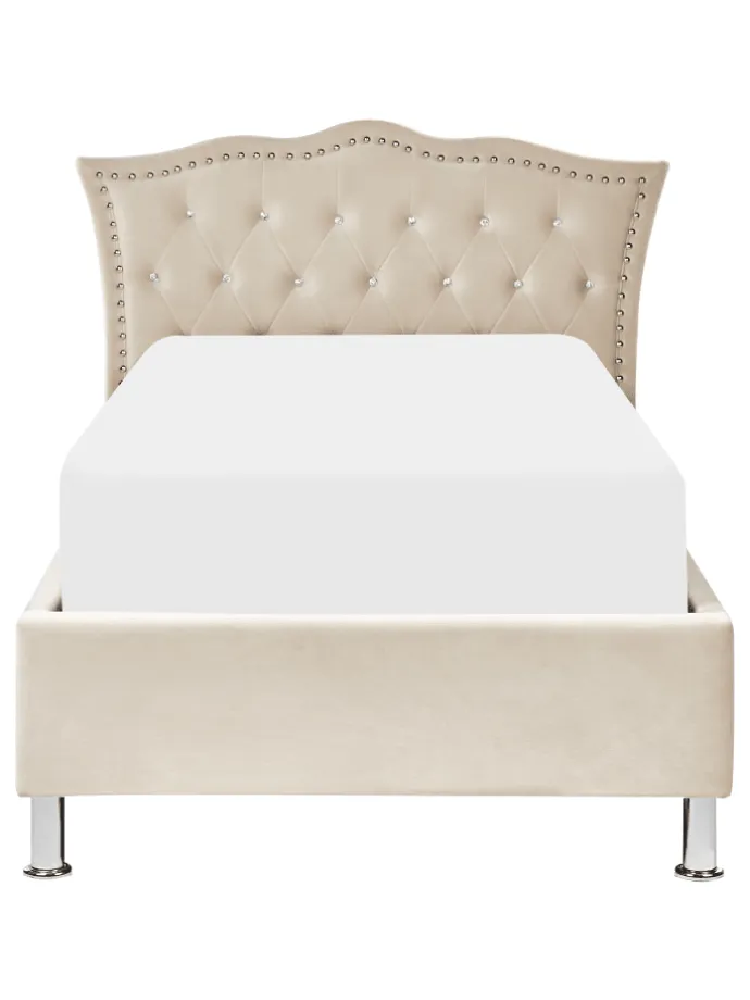 Glamouröses Einzelbett mit hohen Kopfteil im Chesterfield-Stil und hochklappbarem Lattenrost. In diesem charmanten Chesterfield-Bett kann Ihr Nachwuchs immer mit einem königlichen Schlaf rechnen. Der geschmeidige Samtbezug ist nicht nur sehr hochwertig, sondern auch elegant, langlebig und pflegeleicht. Das hohe Kopfteil des Samtbettes ist mit einer stilvollen Knopfheftung besetzt, die sich aus künstlichen Kristall-Knöpfen zusammensetzt. Zusammen mit der Nietenumrandung, der edlen Diamantsteppung und dem formschönen Design verbreiten sie einen anspruchsvollen Glam-Look. Der hochklappbare Lattenrost bietet der Matratze die notwendige Unterstützung und Stabilität, um einen angenehmen Schlaf zu gewährleisten. In dem praktischen Bettkasten kann man seine Bettwäsche verstecken und dabei die Unterseite des Modells voll ausnutzen. Dank all diesen Eigenschaften eignet sich der Bettrahmen für jedes Kinder- und Jugendzimmer oder auch als Gästebett.