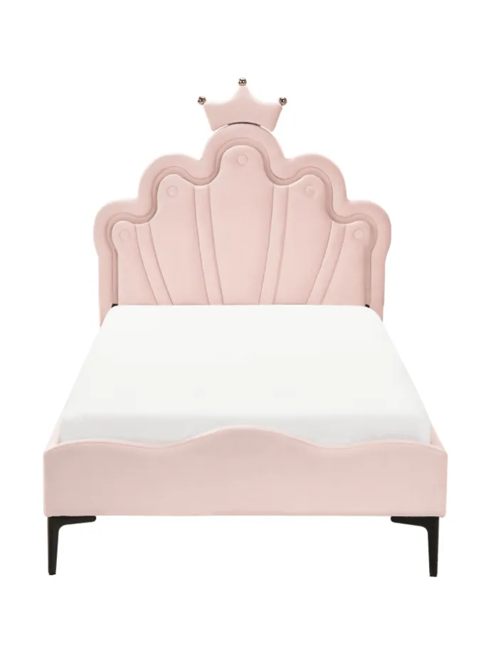 Modernes Kinderbett mit Lattenrost und niedlichem LED-Kopfteil. Dieses zauberhafte Prinzessinnen-Bett verwandelt jeden Raum in eine königliche Suite. Die robuste Konstruktion und der mitgelieferte Lattenrost steigern den Schlafkomfort. Zudem punktet das Bett mit einer LED-Beleuchtung, die im Kopfteil integriert ist. Mit diesem LED-Licht kreieren Sie eine beruhigende Umgebung für Ihre Kleinen, damit Sie eine angenehme Nachtruhe genießen und in einer märchenhaften Atmosphäre träumen können. Der leicht schimmernde Samtbezug ist sowohl weich als auch pflegeleicht. Die schlanken, dennoch stabilen Metallbeine sorgen für langanhaltende Haltbarkeit und eine optimale Einstiegshöhe.