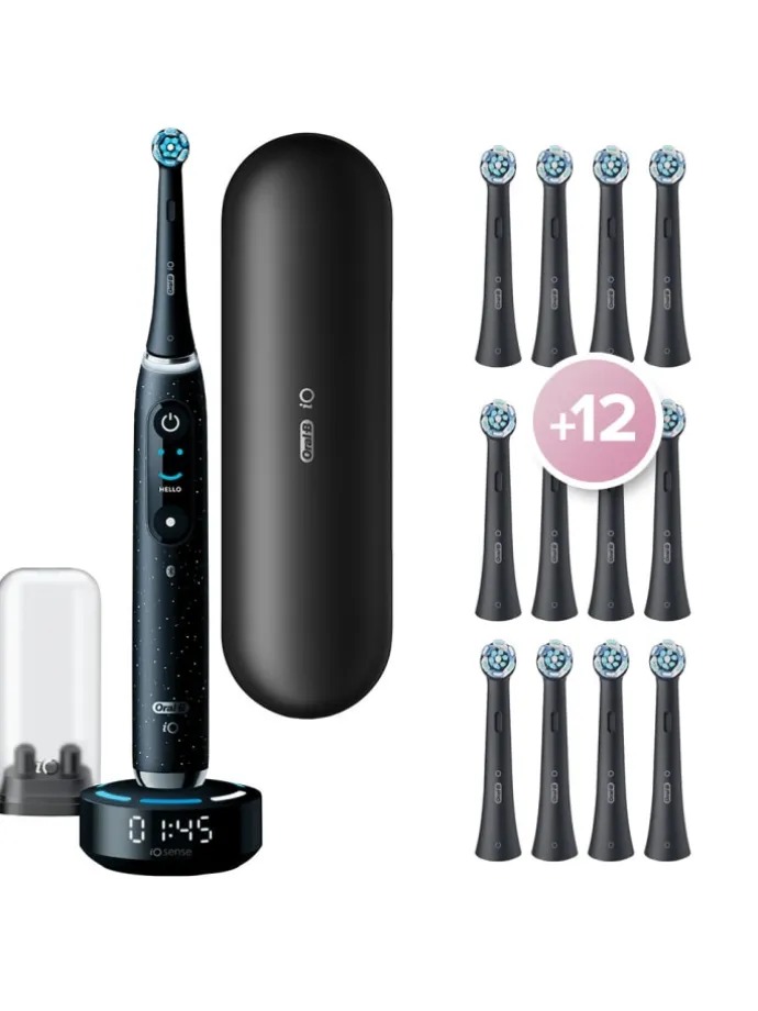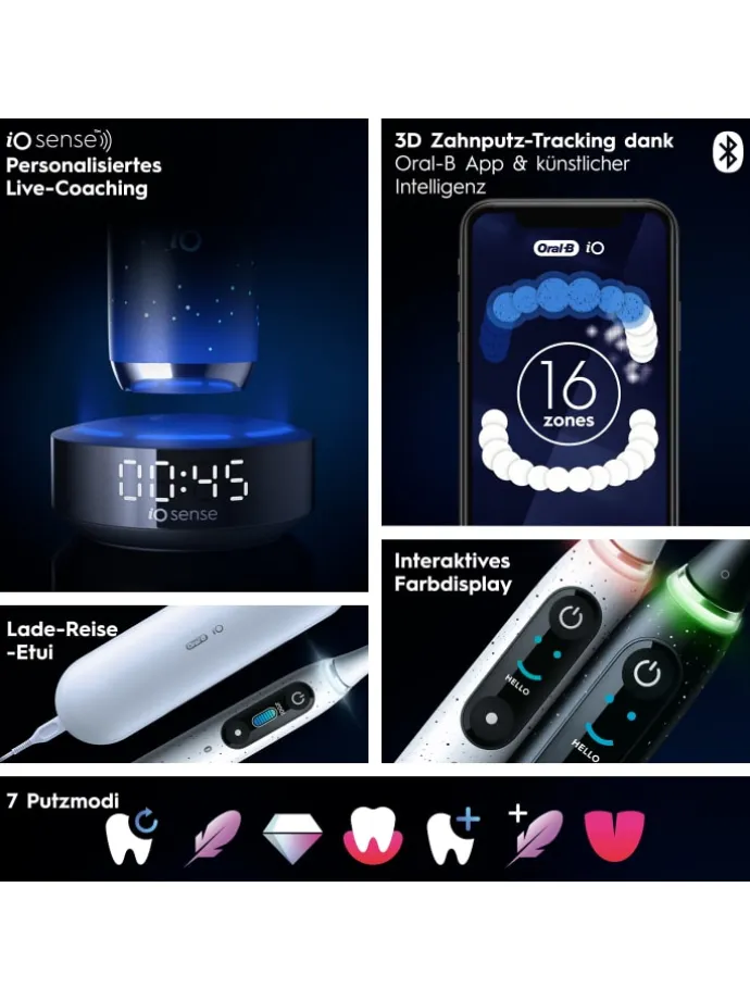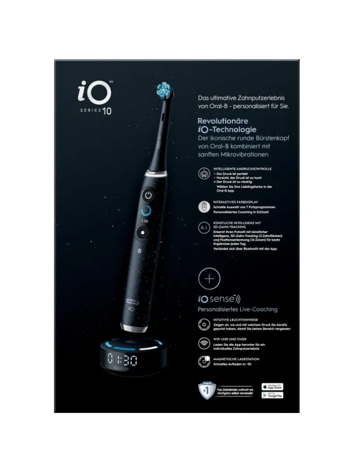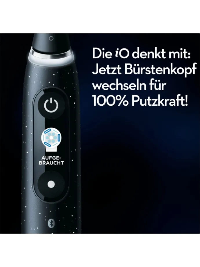 Die iO 10 elektrische Zahnbürste mit der revolutionären iO Sense Ladestation bietet Ihnen personalisiertes Echtzeit-Feedback, um zu wissen wo, wann und wie Sie putzen müssen-für ein effektives und angenehmes Putzerlebnis. Sie kombiniert sanfte Mikrovibrationen mit dem einzigartigen, runden Bürstenkopf von Oral-B und sorgt so jeden Tag für das Gefühl einer professionellen Zahnreinigung. Wechseln Sie die Aufsteckbürste Ihrer Oral-B iO Zahnbürste alle 3 Monate, um beste Ergebnisse zu erzielen.