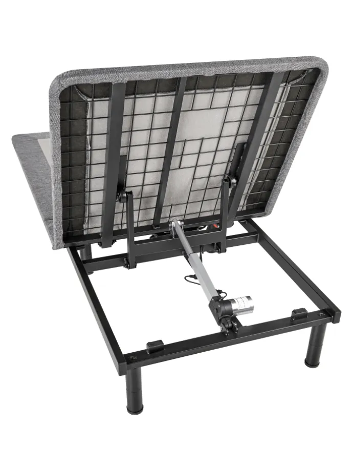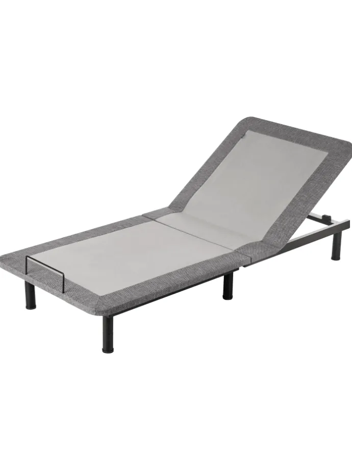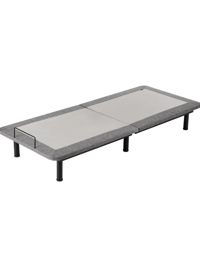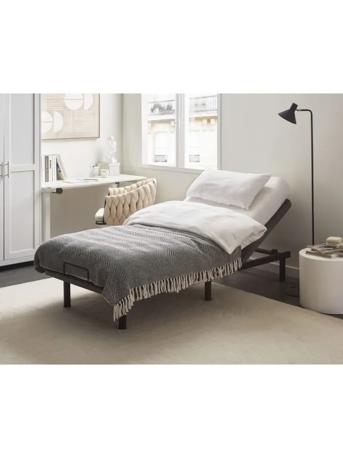 Gepolsterte Unterfederung für Einzelmatratzen. Dieser elektrische Lattenrost ist genau das, was Sie brauchen, um sich einen komfortablen und durchdachten Schlafbereich einzurichten. Der schwarze Metallrost zeichnet sich durch seine Robustheit und einen sicheren Stand aus. Zudem ist er in einen weichen, grauen Stoffbezug gehüllt, der dem Bettgestell einen modernen Look verleiht. Das Kopfteil lässt sich per Fernbedienung verstellen und sorgt so für individuellen Komfort. Die Beine können auf vier verschiedene Arten zusammengefügt werden, um die Höhe des Bettes an Ihre Bedürfnisse anzupassen.