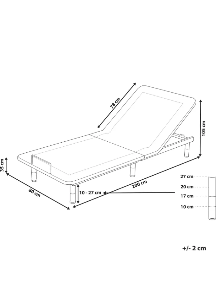 Ausgezeichneter Komfort durch gleichmäßige Gewichtsverteilung, Stabile Konstruktion des Gestells, Praktische Fernbediensteuerung, Die Beine lassen sich in 4 Höhen montieren, Verstellbare Kopfstütze