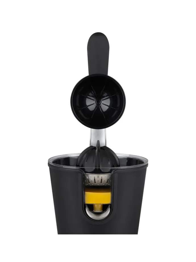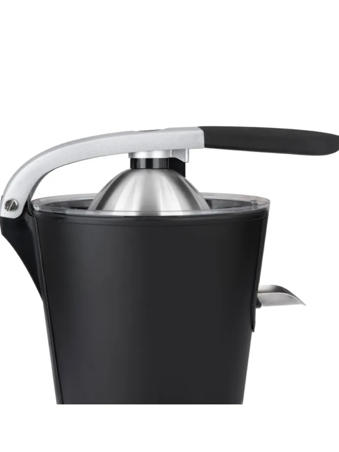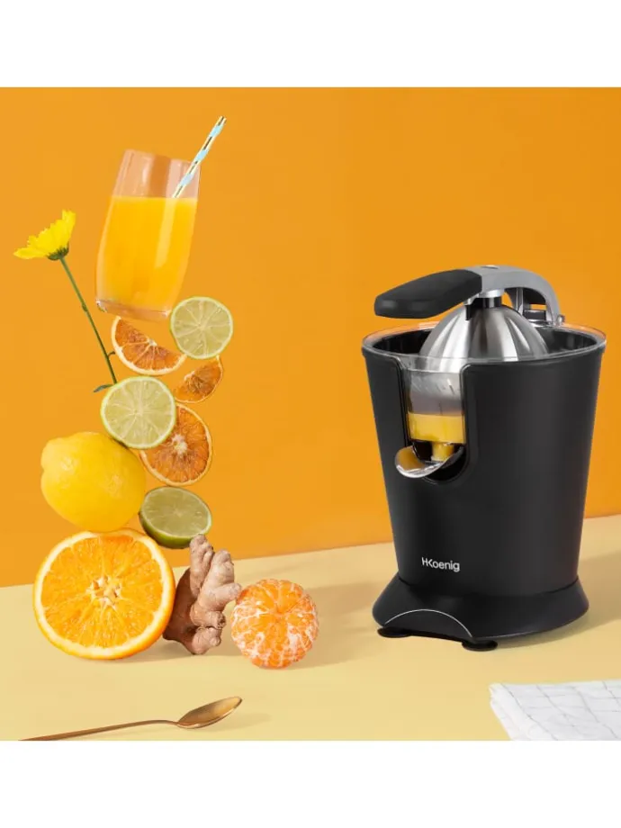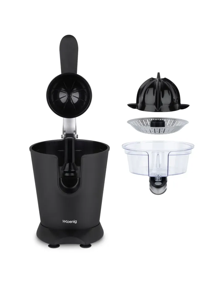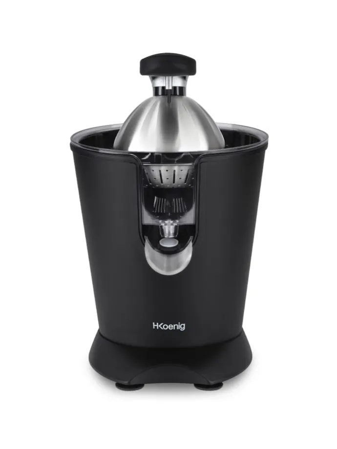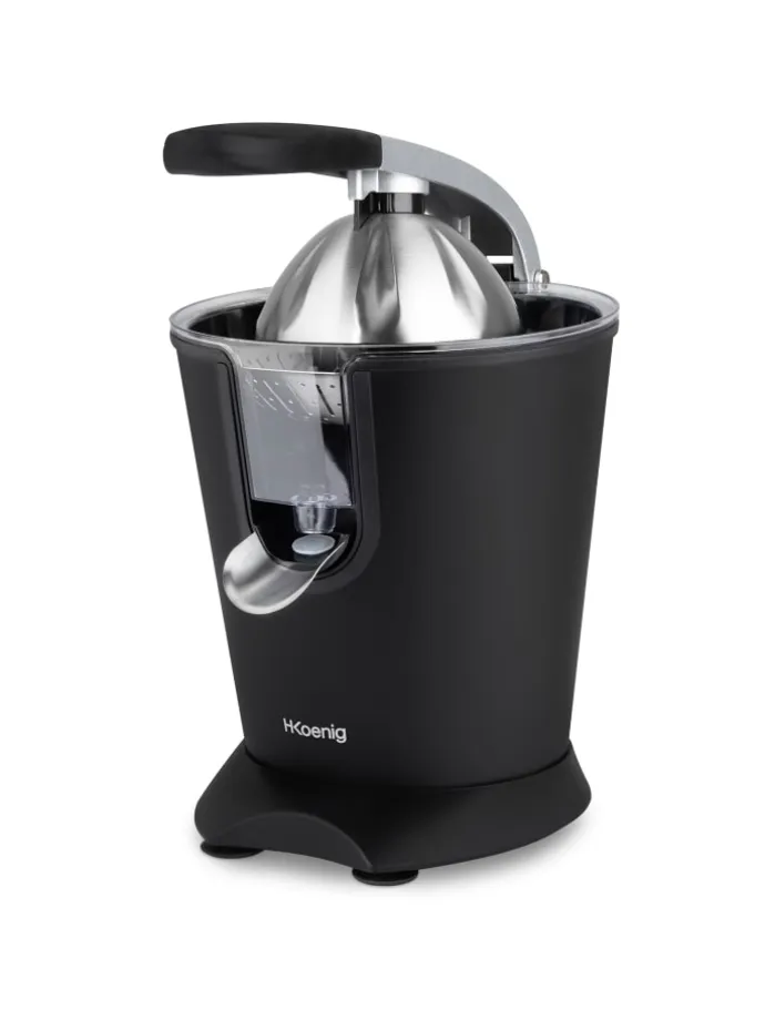 Mit der professionallen Zitruspresse AGR82 von H.Koenig können Sie ab sofort jeden Morgen frische Zitrussäfte ganz einfach und ohne Anstrengung zubereiten. Der kraftvolle Hebelarm erlaubt ein müheloses Entsaften. Der Presskegel beginnt automatisch zu rotieren, sobald Druck von oben ausgeübt wird. Dank des Universalkegels ist die Zitruspresse sowohl für große als auch für kleine Zitrusfrüchte ideal geeignet. Den Saft können Sie direkt in Ihr Glas fließen lassen ohne den Pressvorgang zu unterbrechen. Die Einzelteile sind spülmaschinenfest, sodass eine schnelle und einfache Reinigung am Morgen garantiert ist. Der leistungsstarke 160 Watt Motor erlaubt eine geräuscharme Entsaftung. Mit dem modernen Design aus Edelstahl und einer matten, hellgrünen Bemantelung passt sich die Saftpresse ideal jedem Küchenstil an. Kaufen Sie jetzt die elektrischen Zitruspresse von H.Koenig für eine vitaminreiche Morgenroutine!