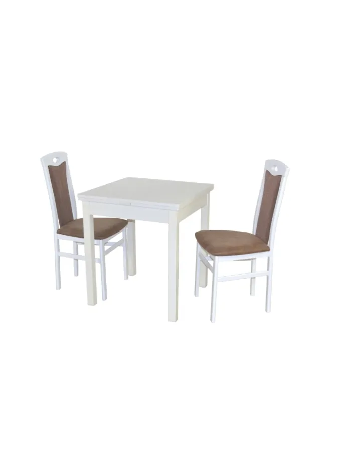 Hochwertige 3tlg. Essgruppe bestehend aus 2 Massivholzstühlen und 1 Esstisch mit zwei Ansteckplatten zum Vergrößern. Stühle aus Massivholz Buche, weiß lackiert. Sitz und Rücken sind bequem schaumstoffgepolstert und mit attraktiven Stoffbezügen bezogen. Sitz mit einem Bezug in Kunstlederoptik (100% Polyester), Rücken mit einem Strukturstoffbezug (90% Polyester/10% Rayon). Praktisch die eingearbeitete Griffmuschel im oberen Rückenbereich. Esstisch mit zwei Ansteckplatten (je ca. 30 cm breit), die rechts/links unter der Tischplatte eingeschogen sind, dadurch lässt sich die Tischplatte einfach und schnell von 67 cm bis auf 127 cm vergrößern. Beine vom Esstisch aus Massivholz Buche, weiß lackiert. Platten aus Holzwerkstoff die mit einem pflegeleichten Melamin-Holzdekor, weiß, beschichtet sind. Die Stühle werden montiert angeliefert, der Esstisch flach verpackt zur Selbstmontage, inklusive Aufbauanleitung. Maße ca. cm je Stuhl: (B/H/T) 45/95/48. Sitzhöhe ca. 46 cm, Sitztiefe ca. 39 cm. Maße ca. cm Esstisch: (B/H/T) 67-127/75/67.