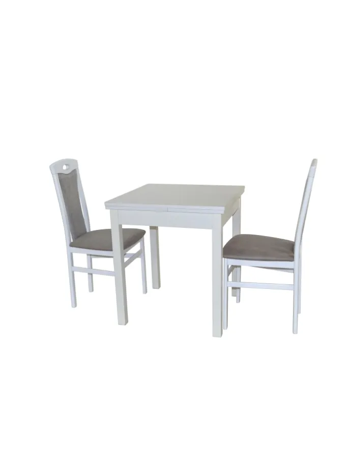 Hochwertige 3tlg. Essgruppe bestehend aus 2 Massivholzstühlen und 1 Esstisch mit zwei Ansteckplatten zum Vergrößern. Stühle aus Massivholz Buche, weiß lackiert. Sitz und Rücken sind bequem schaumstoffgepolstert und mit attraktiven Stoffbezügen bezogen. Sitz mit einem Bezug in Kunstlederoptik (100% Polyester), Rücken mit einem Strukturstoffbezug (90% Polyester/10% Rayon). Praktisch die eingearbeitete Griffmuschel im oberen Rückenbereich. Esstisch mit zwei Ansteckplatten (je ca. 30 cm breit), die rechts/links unter der Tischplatte eingeschogen sind, dadurch lässt sich die Tischplatte einfach und schnell von 67 cm bis auf 127 cm vergrößern. Beine vom Esstisch aus Massivholz Buche, weiß lackiert. Platten aus Holzwerkstoff die mit einem pflegeleichten Melamin-Holzdekor, weiß, beschichtet sind. Die Stühle werden montiert angeliefert, der Esstisch flach verpackt zur Selbstmontage, inklusive Aufbauanleitung. Maße ca. cm je Stuhl: (B/H/T) 45/95/48. Sitzhöhe ca. 46 cm, Sitztiefe ca. 39 cm. Maße ca. cm Esstisch: (B/H/T) 67-127/75/67.