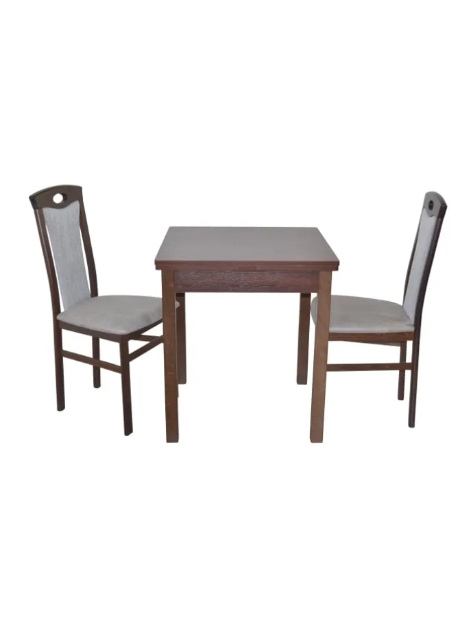 Hochwertige 3tlg. Essgruppe bestehend aus 2 Massivholzstühlen und 1 Esstisch mit zwei Ansteckplatten zum Vergrößern. Stühle aus Massivholz Buche, nussbaumfarben gebeizt und lackiert. Sitz und Rücken sind bequem schaumstoffgepolstert und mit attraktiven Stoffbezügen bezogen. Sitz mit einem Bezug in Kunstlederoptik (100% Polyester), Rücken mit einem Strukturstoffbezug (90% Polyester/10% Rayon). Praktisch die eingearbeitete Griffmuschel im oberen Rückenbereich. Esstisch mit zwei Ansteckplatten (je ca. 30 cm breit), die rechts/links unter der Tischplatte eingeschogen sind, dadurch lässt sich die Tischplatte einfach und schnell von 67 cm bis auf 127 cm vergrößern. Beine vom Esstisch aus Massivholz Buche, nussbaumfarben gebeizt und lackiert. Platten aus Holzwerkstoff die mit einem pflegeleichten Melamin-Holzdekor, Nussbaum-Nachbildung, beschichtet sind. Die Stühle werden montiert angeliefert, der Esstisch flach verpackt zur Selbstmontage, inklusive Aufbauanleitung. Maße ca. cm je Stuhl: (B/H/T) 45/95/48. Sitzhöhe ca. 46 cm, Sitztiefe ca. 39 cm. Maße ca. cm Esstisch: (B/H/T) 67-127/75/67.