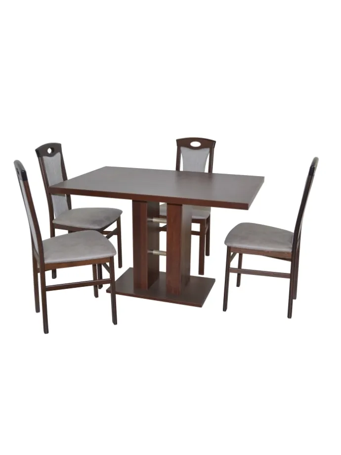 Hochwertige 5tlg. Essgruppe bestehend aus 4 Massivholzstühlen und 1 Esstisch. Stühle aus Massivholz Buche, nussbaumfarben gebeizt und lackiert. Sitz und Rücken sind bequem schaumstoffgepolstert und mit attraktiven Stoffbezügen bezogen. Sitz mit einem Bezug in Kunstlederoptik (100% Polyester), Rücken mit einem Strukturstoffbezug (90% Polyester/10% Rayon). Praktisch die eingearbeitete Griffmuschel im oberen Rückenbereich. Esstisch mit einem modernen Säulengestell komplett aus Holzwerkstoff gefertigt und mit einem strapazierfähigen, pflegeleichten Melamin-Holzdekor, Nussbaum-Nachbildung, beschichtet. Zusätzlich 2 silberfarbene Rohre im Säulengestell kombiniert. Die Stühle werden montiert angeliefert, der Esstisch flach verpackt zur Selbstmontage, inklusive Aufbauanleitung. Maße ca. cm je Stuhl: (B/H/T) 45/95/48. Sitzhöhe ca. 46 cm, Sitztiefe ca. 39 cm. Maße ca. cm Esstisch: (B/H/T) 120/75/80