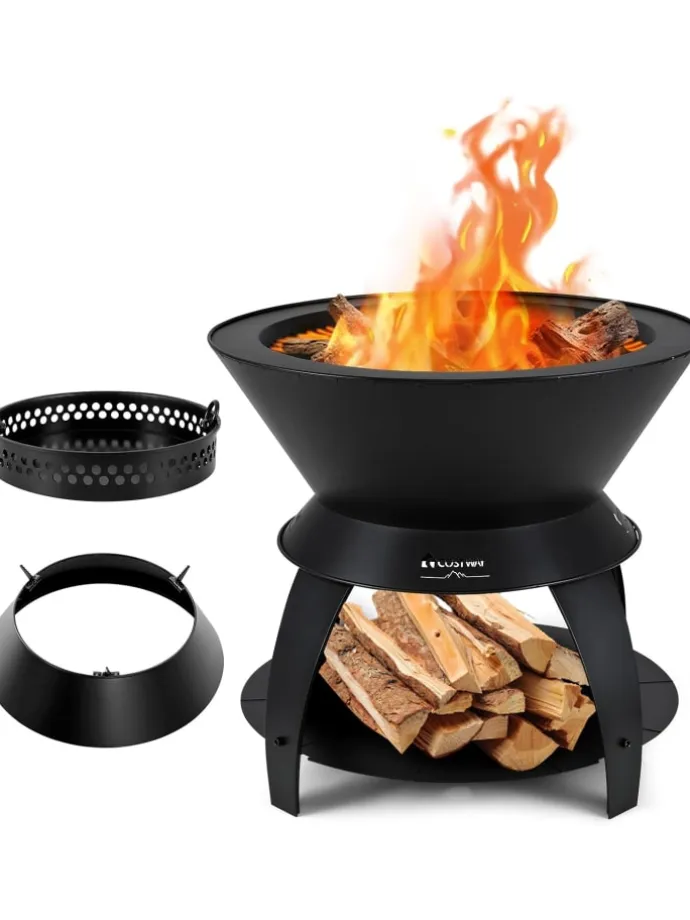 Das innovative Design fördert eine zweistufige Verbrennung und sorgt dafür, dass Sie die meiste Wärme aus minimalem Holzverbrauch erhalten. Diese 3-in-1-Feuerstelle dient als Kochstelle mit ihrem Topfhalter oben, als gemütliches Lagerfeuer oder als BBQ-Grill für angenehme Zusammenkünfte. Hergestellt aus robuster Zn-Fe-Legierung und getragen von stabilen Beinen, ist die Feuerstelle auf langlebigen Einsatz ausgelegt. Sie haben die Wahl zwischen verschiedenen Brennstoffoptionen, darunter Pellets, Holz und Holzkohle. Außerdem ist die Reinigung dank der praktischen Ascheschale ein Kinderspiel.