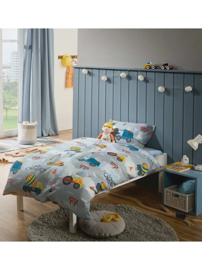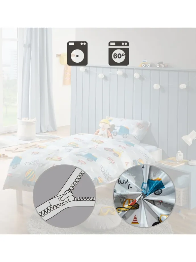 REDBEST Flanell Kinder-Bettwäsche. Auf der kindgerecht gezeichneten Bettwäsche mit coolen Baustellenfahrzeugen, Verkehrszeichen und Schriftzügen gibt es eine Menge zu entdecken. Was für ein Vergnügen, sich in der kalten Jahreszeit in den flauschigen, dichtgewebten Stoff zu kuscheln. Seine Oberfläche wurde sanft aufgeraut, um den kuscheligen und wohlig-wärmenden Charakter zu erhalten. Diese Qualität ist nicht nur temperaturausgleichend, hautsympathisch und atmungsaktiv, sondern auch bügelleicht und einfach zu beziehen durch den praktischen Reißverschluss.