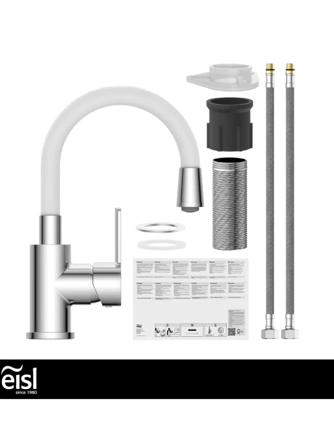 Im Lieferumfang enthalten ist ein vollständiges Montageset und eine mehrsprachige, bebilderte Montageanleitung. Die korrosionsbeständigen Anschlussschläuche (400 mm) an das Hauswassersystem sind flexibel und leicht zu montieren.