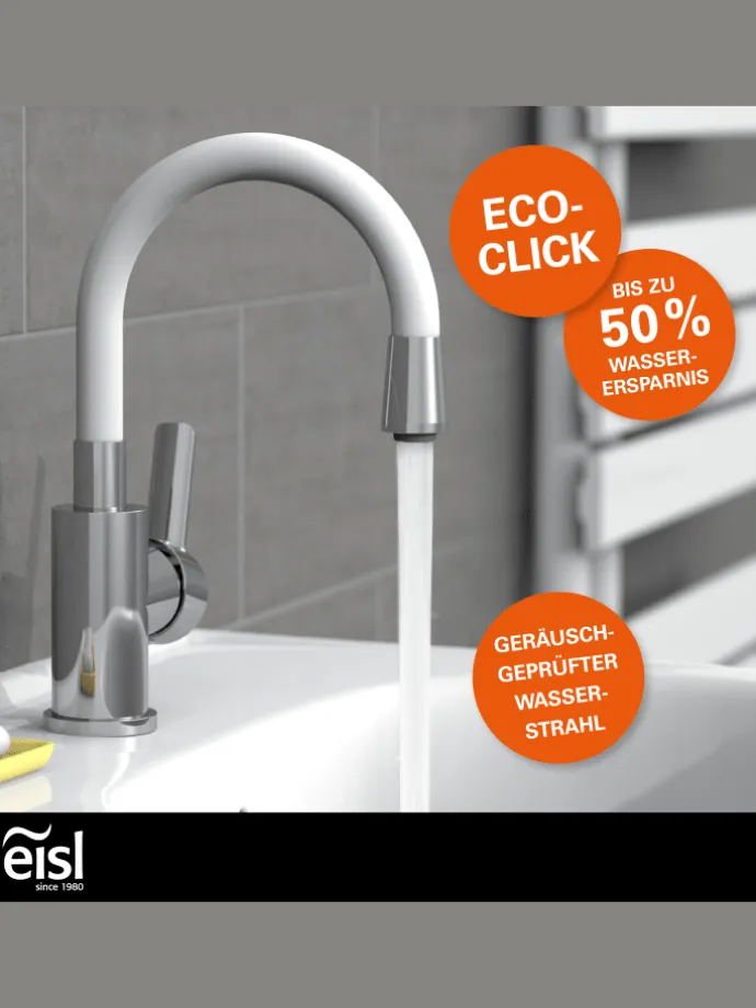 Mit der Eco-Click Funktion – zweistufiger Bedienhebel – kann der Wasserauslauf reduziert werden. Diese Waschtischarmatur spart Wasser, Energie und Geld und leistet einen kleinen Beitrag für die Umwelt.