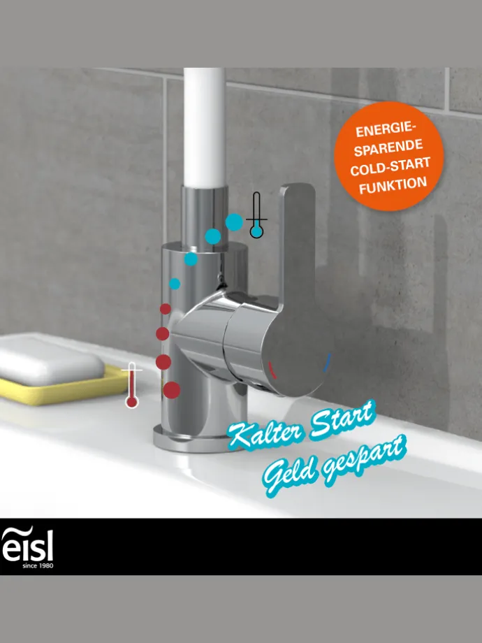 Ressourcenschonend handeln auch im Kleinen? Dann ist diese Einhebel-Mischbatterie mit Cold-Start Technik genau richtig, denn sie gewährt bei senkrechter Position des Bedienhebels nur den Zufluss von Kaltwasser. Bei vielen Waschgängen völlig ausreichend.