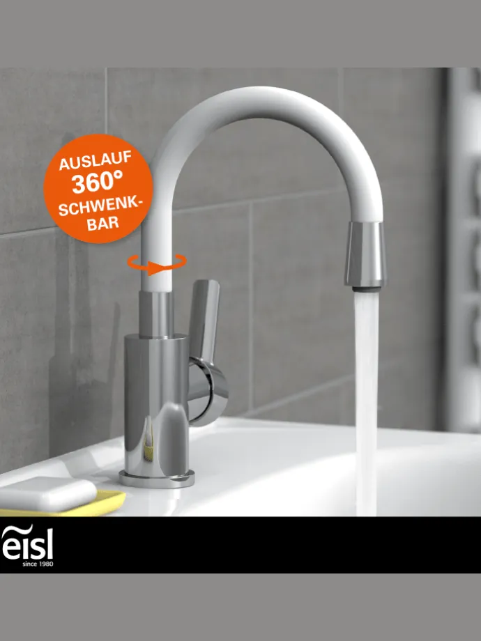 Mit dem 360° schwenkbarem Auslauf kann die Waschbeckenarmatur komfortabel gedreht werden und erleichtert z.B. das Säubern des Waschbeckens oder sorgt für mehr Platz. Einfach schnell mal zur Seite drehen.
