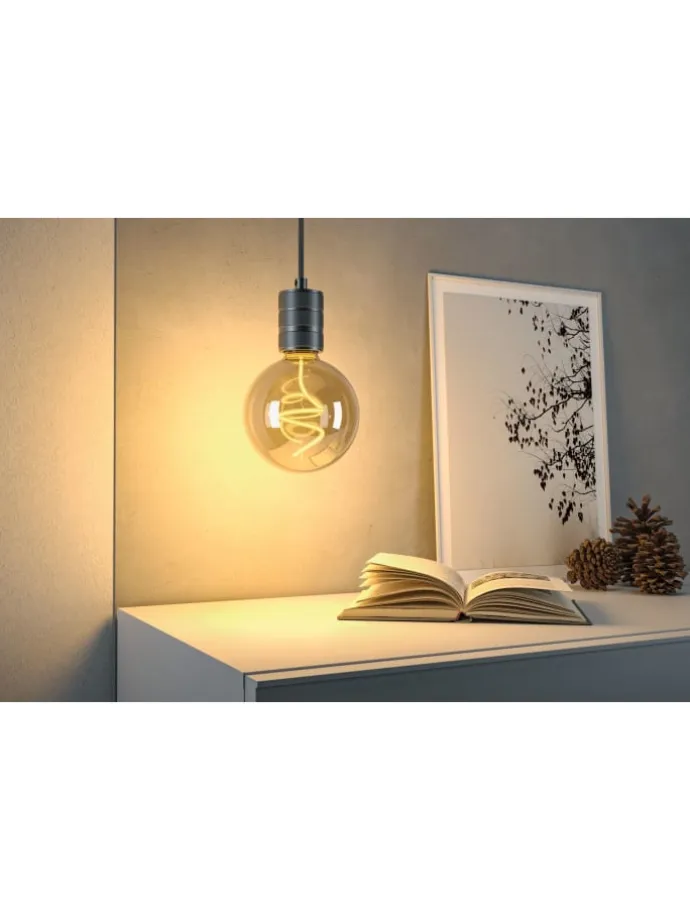 Der LED-Goldglas Globe aus der Edition Floating Shine mit 250lm und 1800K Goldlicht ist ein wahres Meisterwerk der Lichttechnologie. Mit einem einzelnen Filamentfaden, der durch ein gedrehtes Glasröhrchen in Form gehalten wird, bietet der Globe eine einzigartige Ästhetik. Doch nicht nur das Design beeindruckt, sondern auch die Funktionalität. Dank der 360° Lichtabstrahlung entstehen keine unschönen Schatten, sondern ein gleichmäßiges und angenehmes Licht. Dieses puristische Design macht sich ideal in Tisch-, Wand- und Pendelleuchten. Dabei steht nicht die Helligkeit im Vordergrund, sondern das primär dekorative Stimmungslicht. Die Filament Technologie wurde hier neu gedacht und auf das Wesentliche reduziert, um ein einzigartiges Lichterlebnis zu schaffen. Mit der LED Globe Floating Shine wird jeder Raum in ein stimmungsvolles Licht getaucht. Per Wandschalter lässt sich das Leuchtmittel in 3 Stufen dimmen, dies ermöglicht eine vielfältige Licht-Gestaltung.