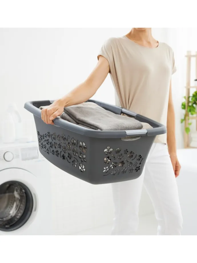 Ist Ihnen die täglich zu verrichtende Arbeit wie Wäsche sortieren, waschen und bügeln auch manchmal zu eintönig? Sehnen Sie sich nach neuem Schwung in diesen Bereichen? Der dekorative Wäschekorb FLOWERS in frischer Blumenoptik erleichtert Ihnen nicht nur jene Routineaufgaben im Haushalt, sondern überzeugt zudem mit formschöner Ästhetik. So wird das Sammeln der Kleidung in dem dafür vorgesehenen Korb nicht nur zum optischen Highlight, auch der anschließende Transport der nassen Wäsche gestaltet sich dank der ergonomisch geformten Tragegriffe handlich und leicht. Das durchbrochene florale Blumenmuster nützt nicht nur der Luftzirkulation, sodass Schimmel vermieden wird, sondern macht den Korb auch abseits ihres eigentlichen Einsatzgebietes in der Waschküche zum universellen Helfer. Ob zum Aufbewahren von Bad- und Hygieneartikeln oder als belastbare Tragemöglichkeit für den Wocheneinkauf: Der Rotho Wäschekorb FLOWERS überzeugt auf vielfältige Weise und ist eine nützliche Bereicherung für Ihren gesamten Haushalt!