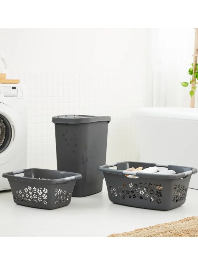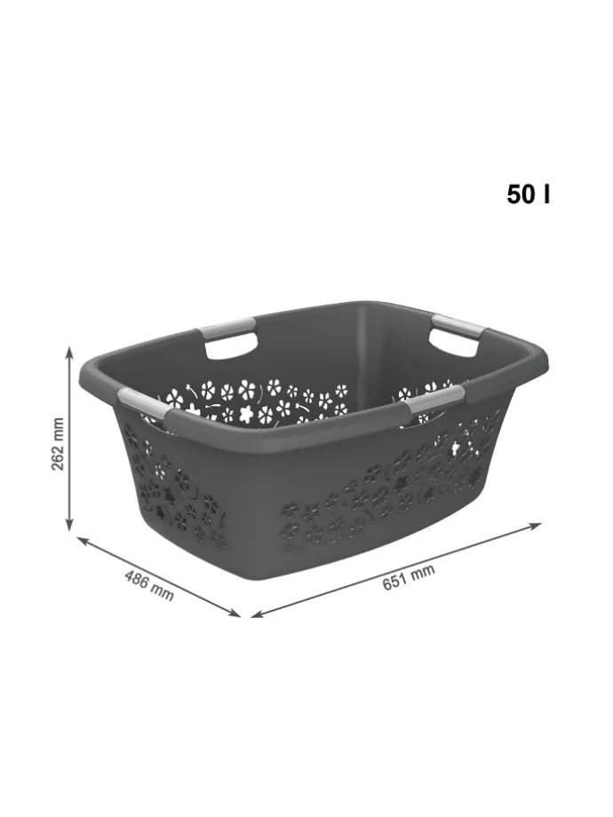Mit einem Fassungsvolumen von 25 oder 50 Litern ist der dekorative Wäschekorb FLOWERS ein echtes Vielseitigkeitstalent. Hinzukommend überzeugt er mit seiner Herstellung aus Kunststoff. Die hochwertige Ausführung der Produktlinie FLOWERS wird mittels eines eindrucksvoll polierten Blumendesigns hervorgehoben. Der Rand des Wäschekorbs weist eine leicht abgerundete, geschwungene Kontur sowie zwei komfortable Tragegriffe auf. Bei Nichtgebrauch lassen sich die Wäschekörbe der Serie FLOWERS kompakt ineinander stapeln. Die hohe Qualität der Haushaltsprodukte des Herstellers Rotho wird durch eine zwanzigjährige Haltbarkeitsgarantie und ein angemessenes Preis-Leistungs-Verhältnis definiert.