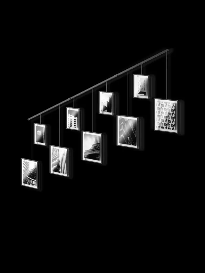 Exhibit besteht aus einer Metallschiene mit Wandhalterungen, an der 9 Glasbilderrahmen unterschiedlicher Größen befestigt sind.