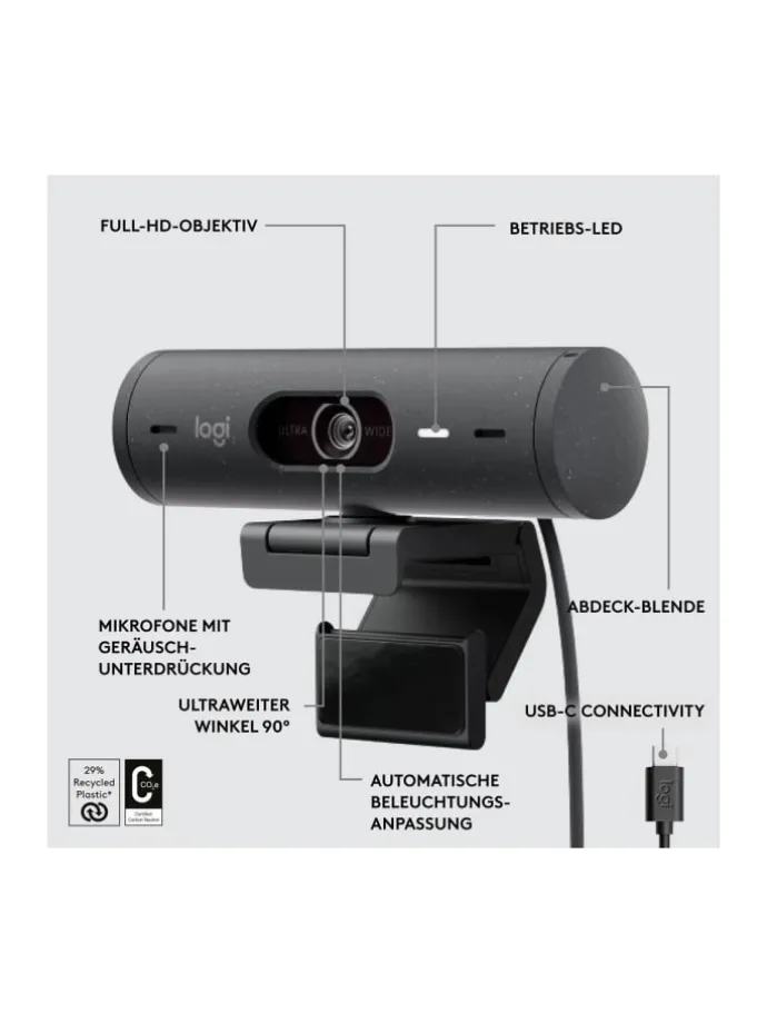 Die BRIO 500 Webcam sorgt dank FullHD 1080p Auflösung mit RightLight 4 Technologie sowie Stereo-Mikrofon für herausragende Bild- und Tonqualität. Im innovativen neuen Show Mode kann die Kamera nach unten geneigt werden, um die Arbeit auf dem eigenen Schreibtisch zu präsentieren. Die mitgelieferte Halterung ist mit einem Mikro-Saugnapf ausgestattet, mit dem die Webcam an der Rückseite des Monitors befestigt wird, sodass Einstellungen schnell mit nur einer Hand vorgenommen werden können. Auf Wunsch kann die Kameralinse mit nur einem Dreh abgedeckt werden, um so die Privatsphäre zuverlässig zu schützen. Die Webcam besteht zu 68% aus recyceltem Kunststoff.