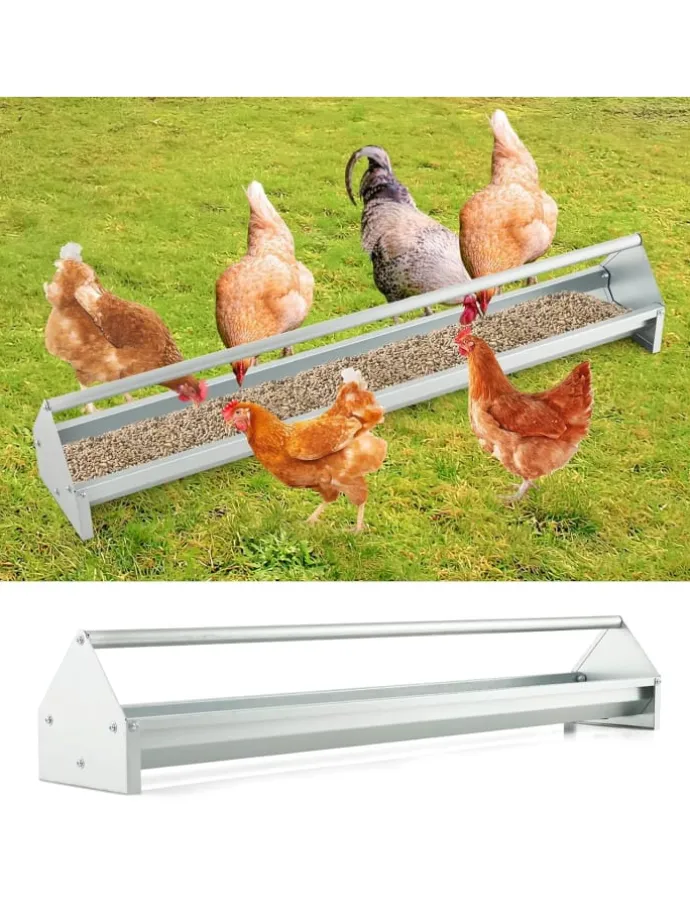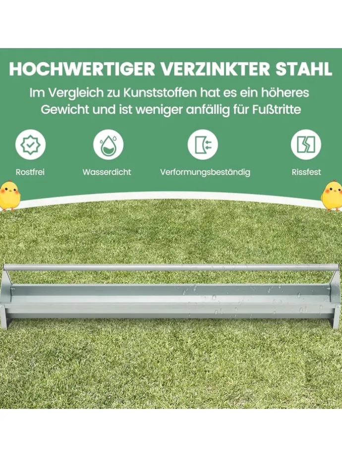 Entscheiden Sie sich für unseren Hühnerfuttertrog aus Metall und erleben Sie, wie er Ihre Geflügelpflegeroutine verbessern kann. Unser Hühnerfuttertrog aus Metall mit großem Fassungsvermögen ermöglicht Ihnen die Fütterung von zwei Seiten, sodass 12 Hühner gleichzeitig fressen können. Dank des Designs mit gefalteten Kanten sind die Hühner weniger anfällig für Verletzungen. Außerdem verhindert die drehbare Stange, dass Vögel darauf treten. Ausgestattet mit zwei Abflusslöchern kann überschüssiges Wasser ablaufen, sodass Ihre Hühner Zugang zu frischem und trockenem Futter haben. Die zwei Stopfen sorgen dafür, dass beim Fressen Ihrer Hühner nichts verschwendet wird und keine Unordnung entstehen. Unser Futterbehälter aus verzinktem Metall ist wasserdicht und rissbeständig.