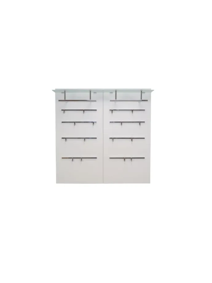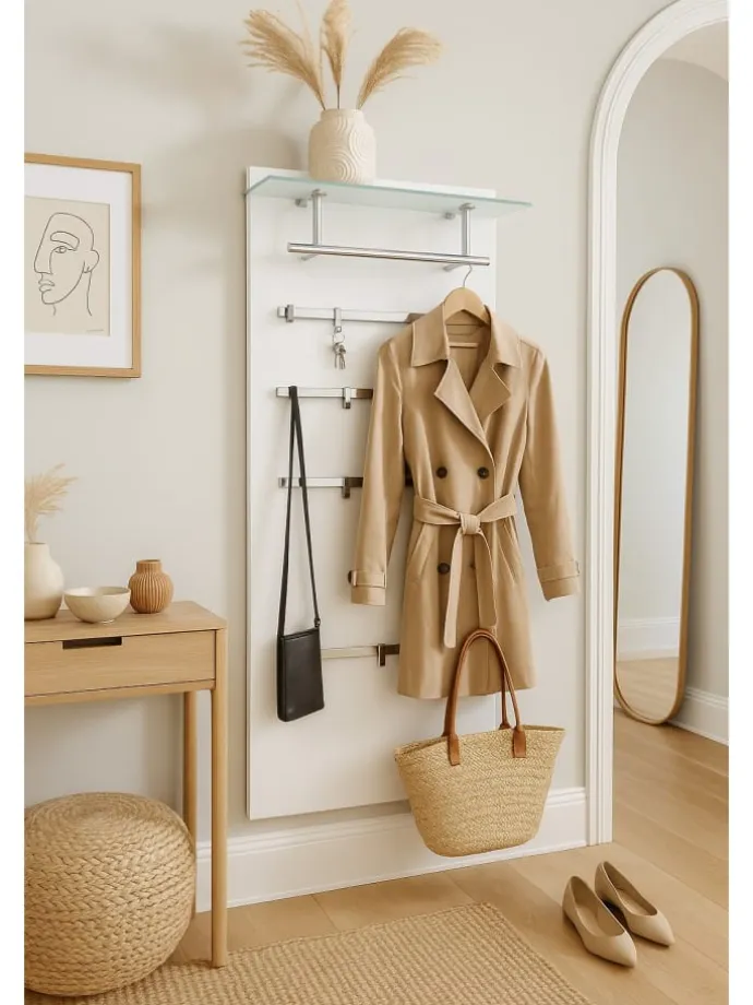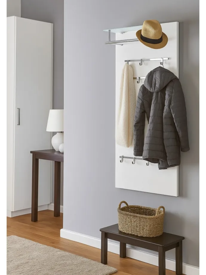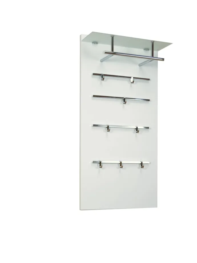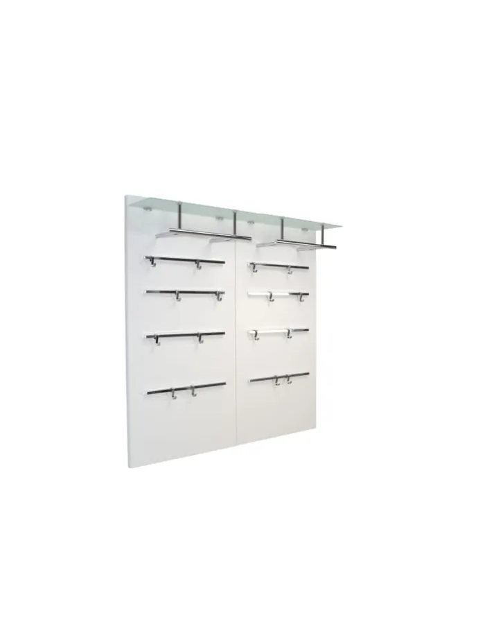 Modernes Wandgarderobenpaneel mit einem Glasboden aus Sicherheits-Milchglas, darunter chromfarbene Kleiderstange aus Stahlrohr. Auf dem Paneel sind insgesamt 4 chromfarbene Metallleisten aufgesetzt, mit insgesamt 8 Kleiderhaken, die individuell angebracht werden können. Paneele ist aus MDF, weiß beschichtet. Ohne Dekoration. Im Lieferumfang ist die Paneele wie beschrieben. Wenn mal mehr Platz benötigt wird, lassen sich auch problemlos zwei nebeneinander montieren. Gesamtmaße ca. cm: B. 60 x H. 120 x T. 26