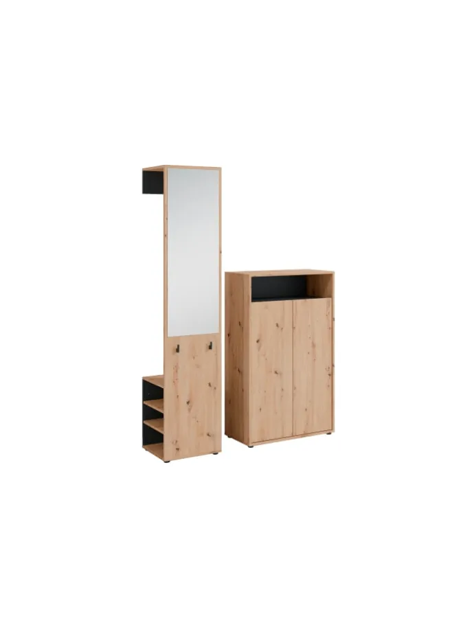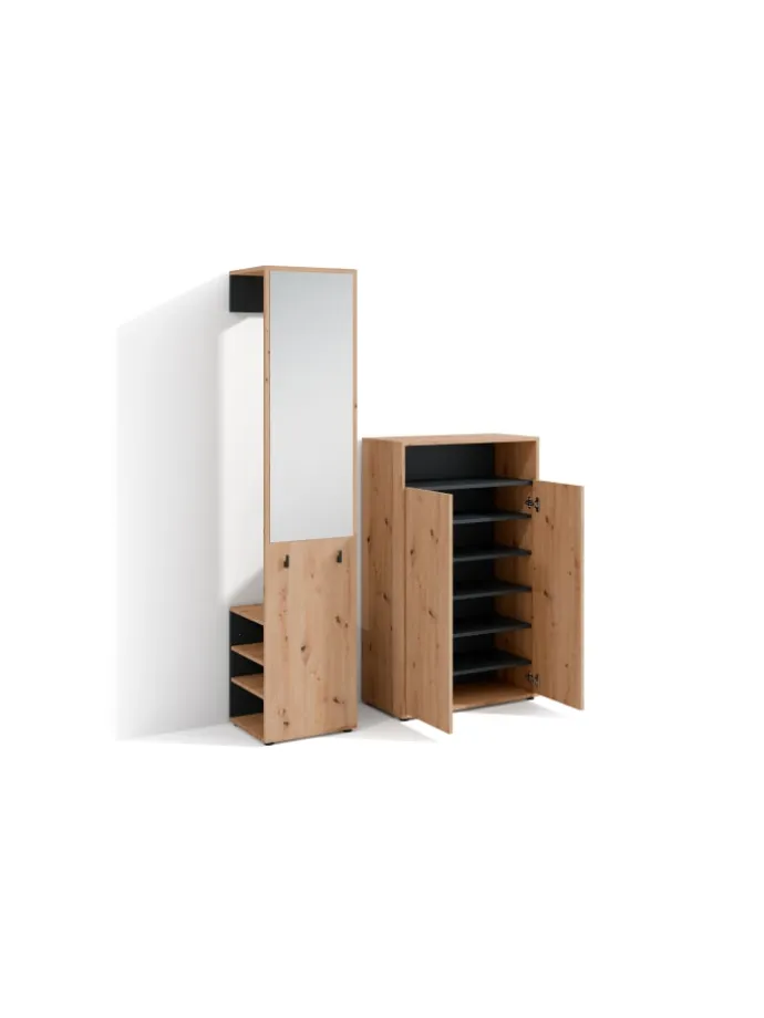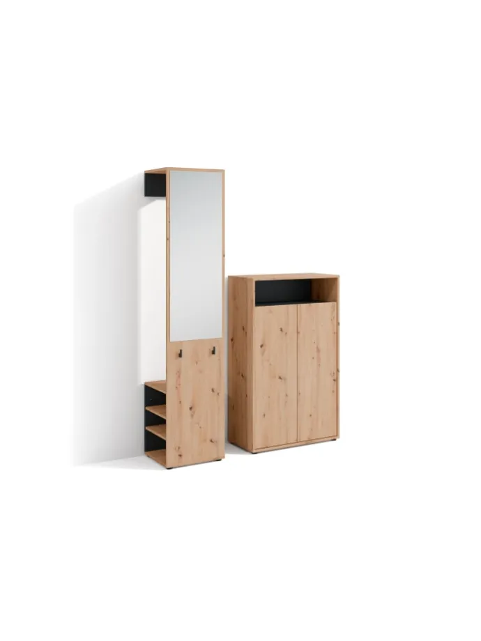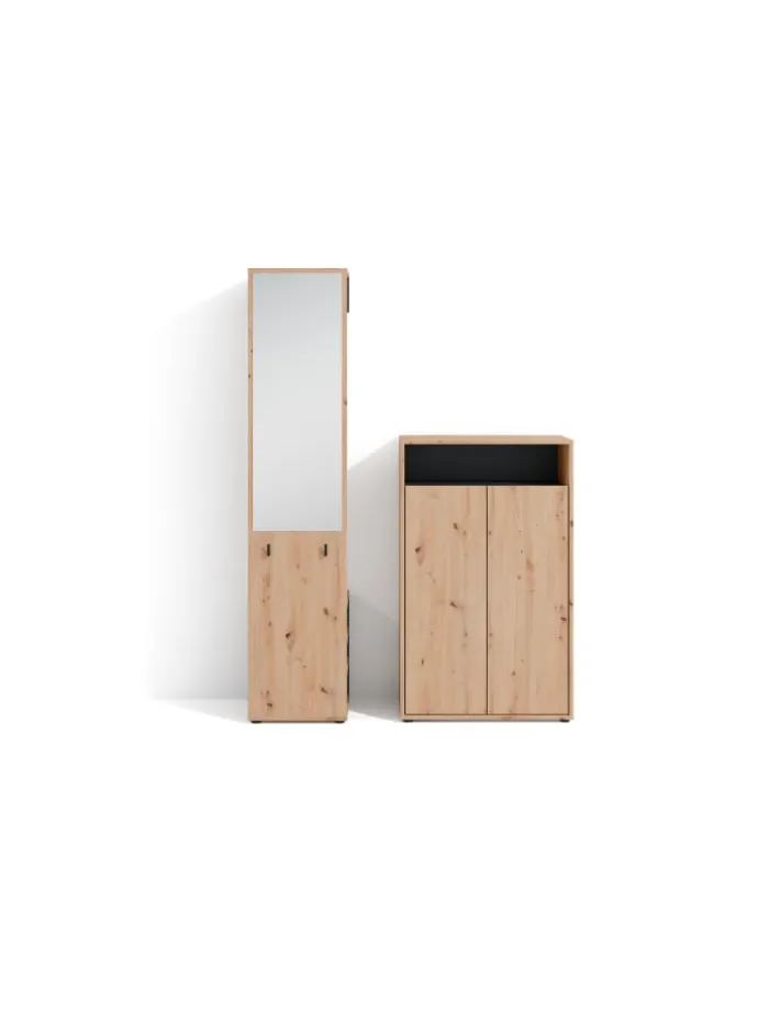 Das Garderoben-Set LYON, ein stilvolles und praktisches Add-on für jedes moderne Zuhause. Dieses Set, bestehend aus einem Hochschrank mit integriertem Spiegel und einem geräumigen Schuhschrank, bietet optimale Funktionalität gepaart mit ästhetischem Reiz. Hergestellt in Melamin Artisan Eiche, kombiniert mit stilvollen schwarzen Akzenten – fügt sich das LYON Set nahtlos in jede Wohnästhetik ein. Der Hochschrank mit Spiegel maximiert die Raumausnutzung und bietet gleichzeitig eine schnelle Outfit-Prüfung vor dem Verlassen des Hauses. Der Schuhschrank bietet mit seiner durchdachten Aufteilung ausreichend Platz für Schuhe und hält den Eingangsbereich ordentlich und frei von Unordnung. Ergänzt durch schwarze Kunststoffhaken für zusätzliche Aufhängemöglichkeiten, ist dieses Garderoben-Set nicht nur eine visuelle Bereicherung, sondern auch ein Paradebeispiel für die praktische Nutzung von Wohnraum. Ob im schmalen Flur oder im großzügigen Eingangsbereich, das Garderoben-Set LYON sorgt für eine organisierte und einladende Atmosphäre.