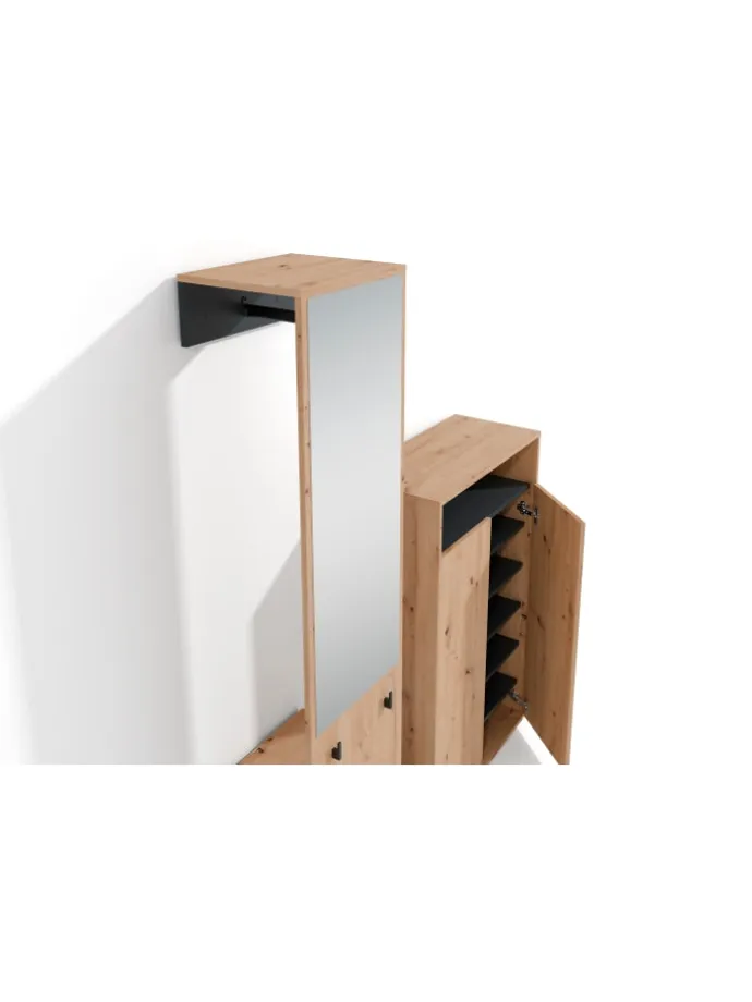 • Maximale Raumausnutzung: Der Hochschrank mit integriertem Spiegel ermöglicht eine schnelle Outfit-Prüfung vor dem Verlassen des Hauses und optimiert gleichzeitig den verfügbaren Platz.