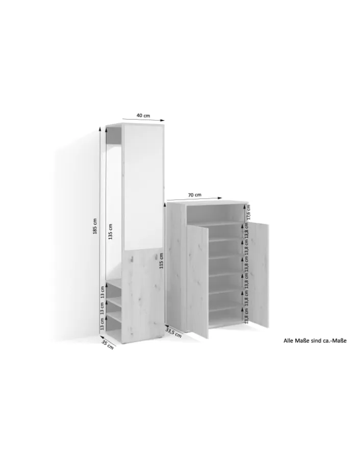 Maße: B 40, H 185, T 35 cm (Hochschrank), B 70, H 115, T 33,5 cm (Schuhschrank)