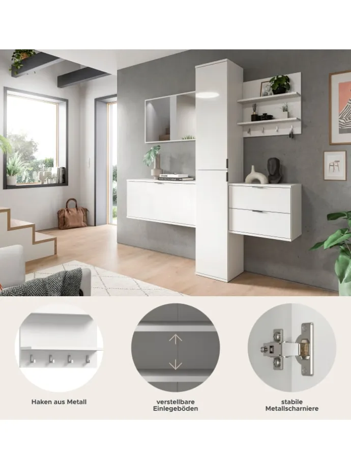 Entdecken Sie unsere beeindruckende Garderobenkombination (B/H/T: 174x191x37 cm) in elegantem Weiß Hochglanz. Sie bringt nicht nur einen modernen Look in Ihren Flur, sondern überzeugt auch durch ihre durchdachte Funktionalität. Diese stilvolle Kombination besteht aus einem großen Spiegel, der Ihren Eingangsbereich optisch vergrößert, sowie einer praktischen Sitzbank, die gleichzeitig als Kommode dient – perfekt für Ihre Sachen. Der vielseitige Hochschrank bietet zusätzlichen Stauraum für Jacken, Schuhe und Accessoires. Das schicke Paneel rundet das Ensemble ab und sorgt dafür, dass Sie alles Nötige zur Hand haben, während es Ihren Flur aufwertet. Ob beim Eintreten oder Verlassen des Hauses, diese Garderobenkombination vereint Ordnung und Stil. Perfekt für alle, die einen modernen, minimalistischen Wohnstil schätzen oder einfach nur eine praktische Lösung für ihren Flur suchen. Holen Sie sich diese Garderobenkombination und verwandeln Sie Ihren Eingangsbereich in einen einladenden Raum!
