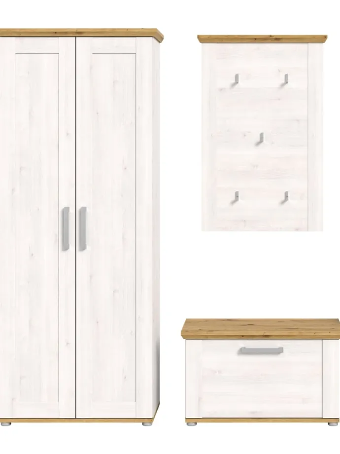 Entdecke unsere geräumige Garderobenkombination in Sibiu Lärche Nachbildung, perfekt für Deinen Flur oder Deiner Diele. Diese Kombiantion bietet eine optimale Lösung zur Organisation Deiner Garderobe, Schuhe und Accessoires, während diese gleichzeitig Deinem Raum eine moderne Note verleiht.