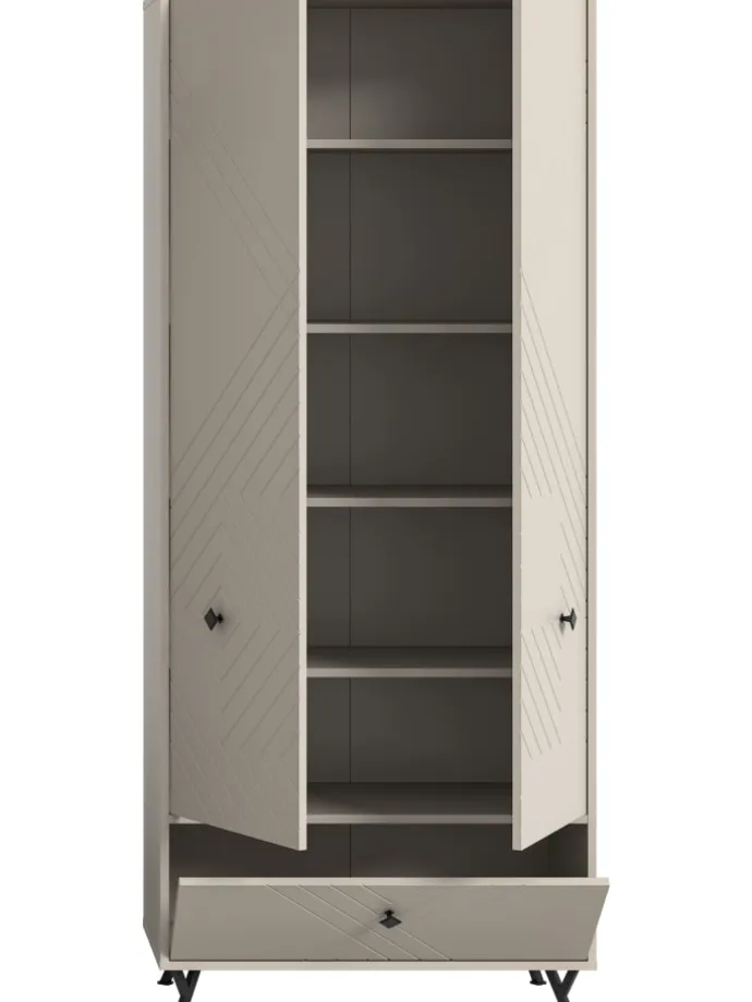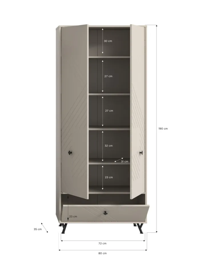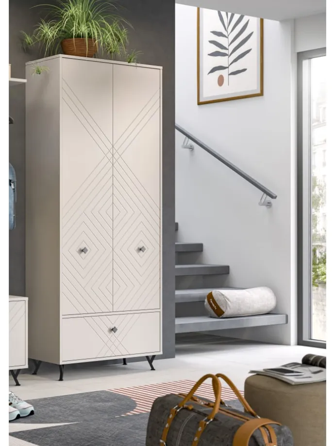 Bereichern Sie Ihren Flur, Ihre Diele oder Ihren Hauswirtschaftsraum mit unserem großzügigen Garderobenschrank in sandbeigem Melamin und matt tiefgezogener Oberfläche. Mit Maßen von 80x190x35 cm bietet er nicht nur ausreichend Stauraum für Ihre Garderobe, sondern verleiht Ihrem Raum auch ein warmes und einladendes Ambiente. Entdecken Sie jetzt die perfekte Lösung für Ordnung und Stil in Ihrem Eingangsbereich.