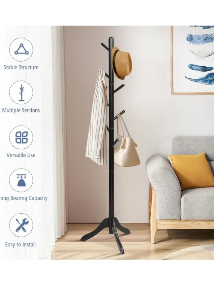 Verabschieden Sie sich von unordentlichen und überfüllten Fluren mit unserer stilvollen Standgarderobe. Dieser gut verarbeitete Garderobenständer verfügt über verstellbare Höhen und ein kinderfreundliches Design, das Gegenstände in Kinderreichweite hält. Der aus massivem Gummibaumholz gefertigte, stabile Stativfuß reduziert die Gefahr des Umkippens, während die 8 mächtigen Haken, von denen jeder satte 5 kg trägt, alle Ihre Mäntel, Hüte und Taschen mühelos tragen können. Maximieren Sie den Platz mit seinem schlanken, platzsparenden Design, das in eleganter, komplett schwarzer Perfektion gehalten ist. Der Zusammenbau dieser Garderobe ist dank der cleveren Zerlegbarkeit und der vormontierten Schrauben ein Kinderspiel. Steigern Sie Ihre Organisationsfähigkeit – schnappen Sie sich jetzt diesen Kleiderständer!