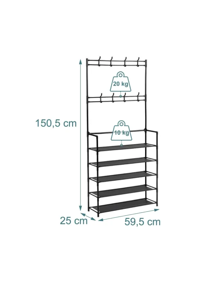 Mit diesem platzsparenden Garderobenständer mit Schuhablagen bringst Du Ordnung in Flur, Schlaf- oder Ankleidezimmer. Auf 4 Ebenen finden bis zu 12 Paar Schuhe, Taschen oder Aufbewahrungsboxen ihren Platz. 8 Doppelhaken bieten zusätzlichen Stauraum für Jacken, Schals, Hüte oder Schlüssel. Dank Stecksystem ist der Aufbau der Schuhgarderobe schnell und einfach erledigt. Das moderne Design aus pulverbeschichtetem Metall und Vliesstoff passt sich jedem Wohnstil an.
