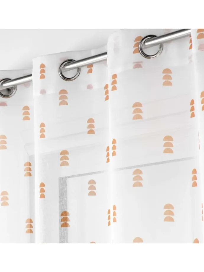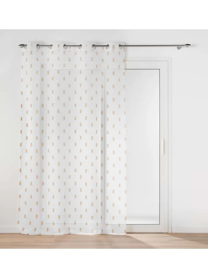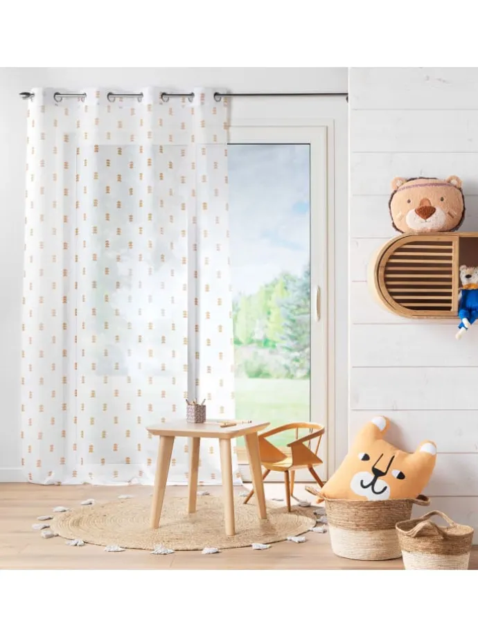 Perfekte Dekoration eines Kinderzimmers: Ein Vorhang mit silbernen Ösen für ein Kinderzimmer. Geometrisches Muster in drei Farben: Senfgelb, Rosa, Grün.