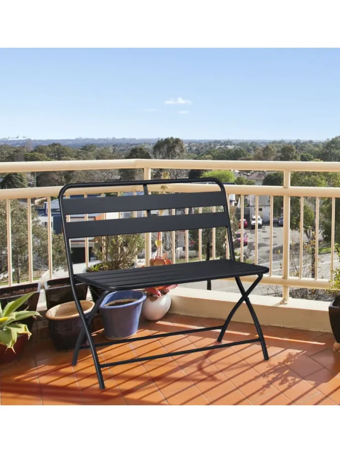 Sorgen Sie mit dieser Gartenbank für Wohlfühlmomente an der frischen Luft. Dank Klapp-Funktion ist die wetterfeste Outdoor Bank schnell in Ihrem Garten, auf der Terrasse oder der Veranda aufgestellt. Vor allem kleine Balkone lassen sich mit der kompakten Sitzbank ideal ausnutzen. Für Komfort sorgt die hohe Rückenlehne. Machen Sie es sich zu zweit – gerne mit zusätzlichem Sitzpolster – so richtig bequem. Die Balkonbank aus solidem Stahl ist pflegeleicht und bei Bedarf einfach feucht abwischbar.