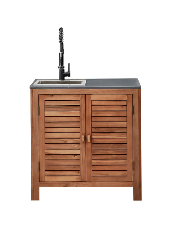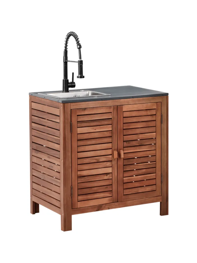 Breiter Garten-Küchenschrank aus Massivholz mit Spüle und Armatur. Ob als eigenständige Kochinsel oder als Erweiterung Ihrer bestehenden Outdoor- oder Indoor-Küche – dieses Küchenmodul bietet Ihnen die perfekte Bühne, um Ihre Gäste mit köstlichen Gerichten zu verwöhnen. Da der Kochschrank aus robustem, geöltem Akazienholz gefertigt und mit einer pulverbeschichteten Stahl-Arbeitsplatte versehen ist, ist er nicht nur vor Schädlingen geschützt, sondern auch besonders robust, langlebig, witterungs- und UV-beständig. Die geräumigen Ablageflächen hinter den Schranktüren ermöglichen eine strukturierte Aufbewahrung Ihrer Küchenaccessoires, während die Tischplatte zur Zubereitung von Speisen genutzt werden kann. Die integrierte Spüle und die schwarze Einhebel-Mischbatterie bestehen aus langlebigem Edelstahl und machen das Abspülen von Lebensmitteln, das Händewaschen oder das Reinigen nach dem Grillen zum Kinderspiel.