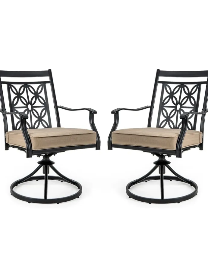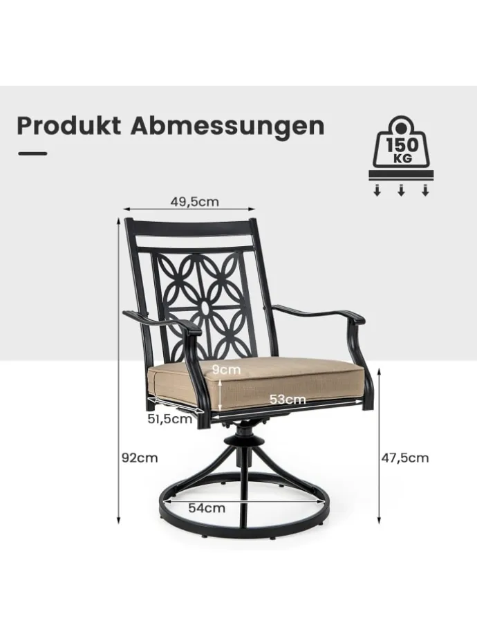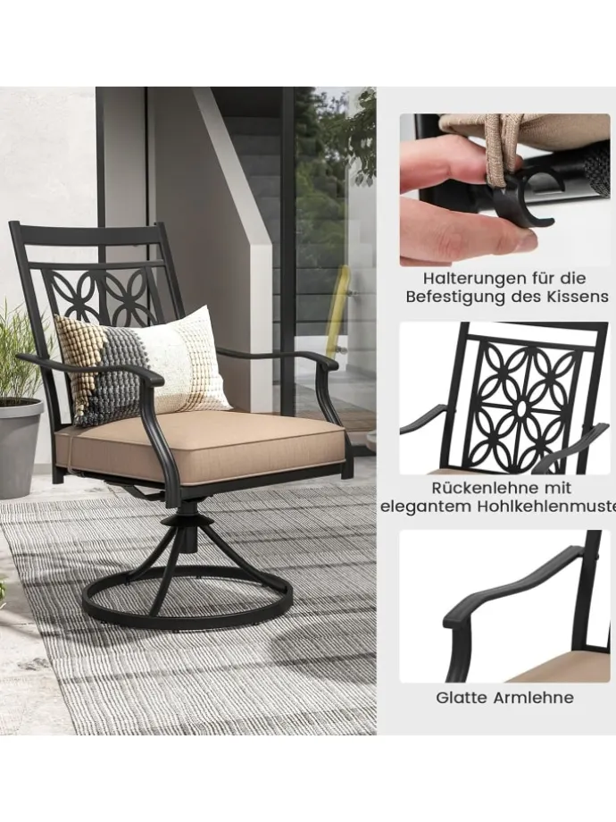 Suchen Sie nach einem Stuhl, der erstklassige Funktionalität und ultimativen Komfort bietet? Suchen Sie nicht weiter. Unser 360-Grad-Drehsessel ist die perfekte Wahl. Mit einem stabilen Metallrahmen und wetterbeständigen Materialien gefertigt, ist dieser Stuhl darauf ausgelegt, den Elementen zu trotzen und Ihr Outdoor-Speiseerlebnis zu verbessern. Mit einem bequemen Sitzkissen und exquisiten Details wie einer eleganten Blütenmuster-Rückenlehne und einer glatten Armlehne können Sie optimalen Komfort und Stil genießen. Außerdem ist unser Stuhl einfach zu montieren und zu reinigen, was die Wartung zum Kinderspiel macht. Rüsten Sie Ihre Outdoor-Sitzgelegenheiten noch heute mit unserem außergewöhnlichen Drehsessel auf.