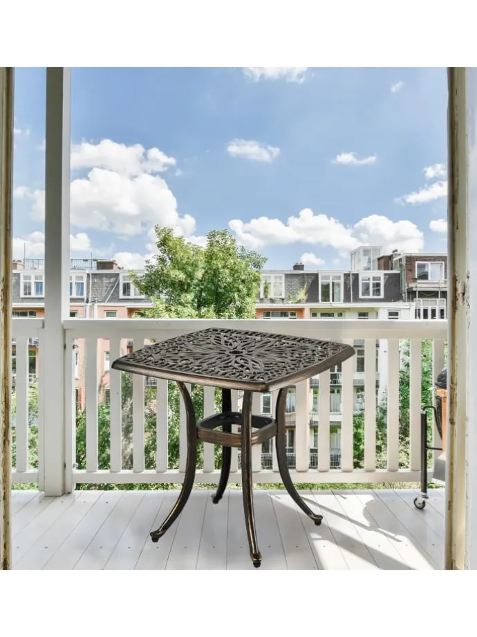 Wenn Du die Gartensaison voll auskosten möchtest, gehört dieser Bistrotisch unbedingt dazu. An dem Balkontisch kannst Du gemütlich mit Familie und Freunden beisammen sitzen, egal ob zum Grillen, Kaffeetrinken oder einfach zum Genießen der Sonne. Im praktischen Schirmloch kannst Du zudem einen Sonnenschirm anbringen und so für ein schattiges Plätzchen sorgen. Das florale Muster macht den Outdoor-Tisch im antiken Design zu einem tollen Hingucker im Garten, auf dem Balkon oder der Terrasse.