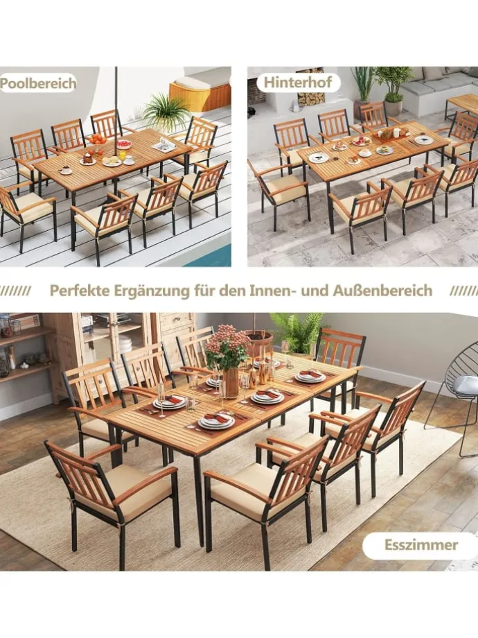 Der rechteckige Tisch bietet Platz für bis zu 8 Gäste und verfügt über ein integriertes 5 cm großes Schirmloch mit abnehmbarer Abdeckung, sodass Sie sich noch mehr entspannen können. Die Tischplatte aus hochwertigem Akazienholz ist sowohl schön als auch langlebig. Er ist mit starken Metallbeinen und zusätzlichen Stützstangen ausgestattet, sorgt für Stabilität und kann bis zu 75 kg tragen. Dieser Tisch mit gut gestalteten Details und zeitlosem Aussehen ist ideal für jeden Essbereich und wird Ihre Atmosphäre deutlich verbessern.