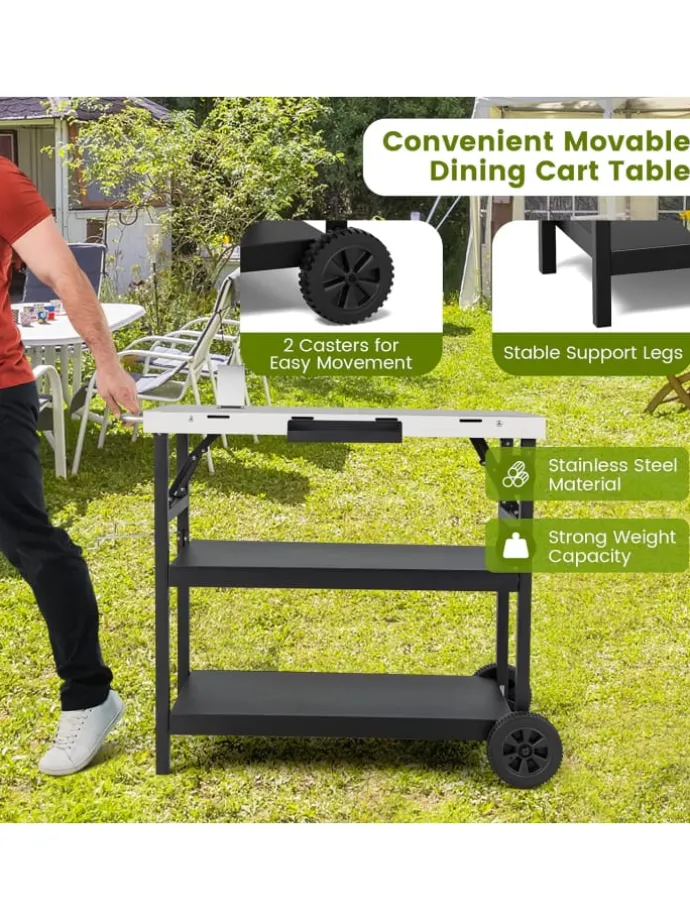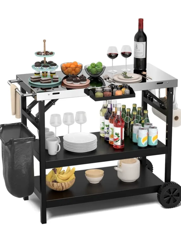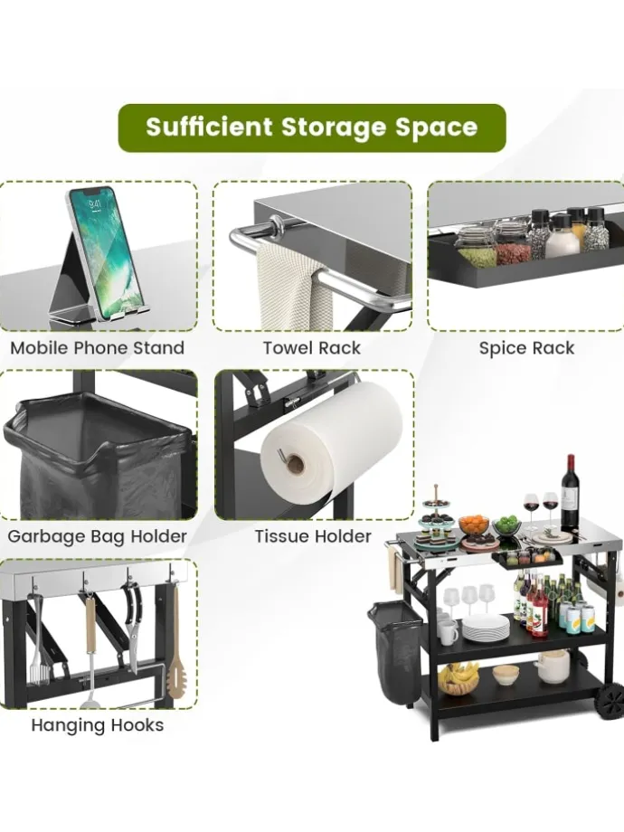 Dieser Tisch für die Essenszubereitung macht Ihre Grillpartys in Zukunft um einiges bequemer. Die Edelstahlplatte mit den Maßen 91 x 45 cm (L x B) bietet viel Platz für die Zubereitung von Speisen und bietet gleichzeitig mehr Aufbewahrungsmöglichkeiten. Unten befinden sich 2 Regale, eines davon ist 4-stufig verstellbar (Abstand zwischen den einzelnen Positionen beträgt 4 cm) für freie Platzgestaltung. Außerdem verfügt der Grillwagen über 4 Aufhängehaken, einen Gewürzständer, einen Telefonhalter, einen Taschentuchhalter und einen Müllständer für verschiedene Aufgaben, was das Kochen einfacher und aufgeräumter macht. Durch Schieben des seitlichen Griffs, der auch als Handtuchhalter dienen kann, lässt sich der Grillwagen ganz einfach an den gewünschten Ort verschieben.