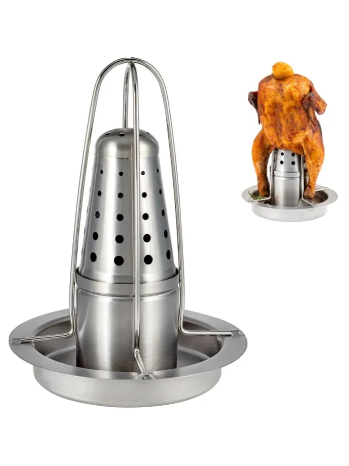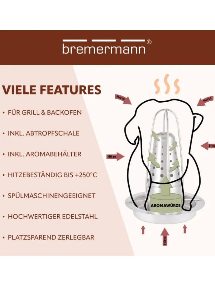 Mit dem bremermann Hähnchenhalter wird Ihnen Freude und Vergnügen garantiert sein. Hähnchen grillen leicht gemacht! Es wird gleichmäßig gegart, dazu bleibt das Fleisch schön saftig und die Haut rundum knusprig.