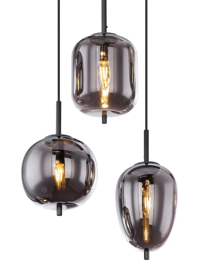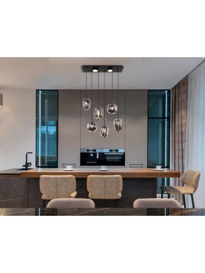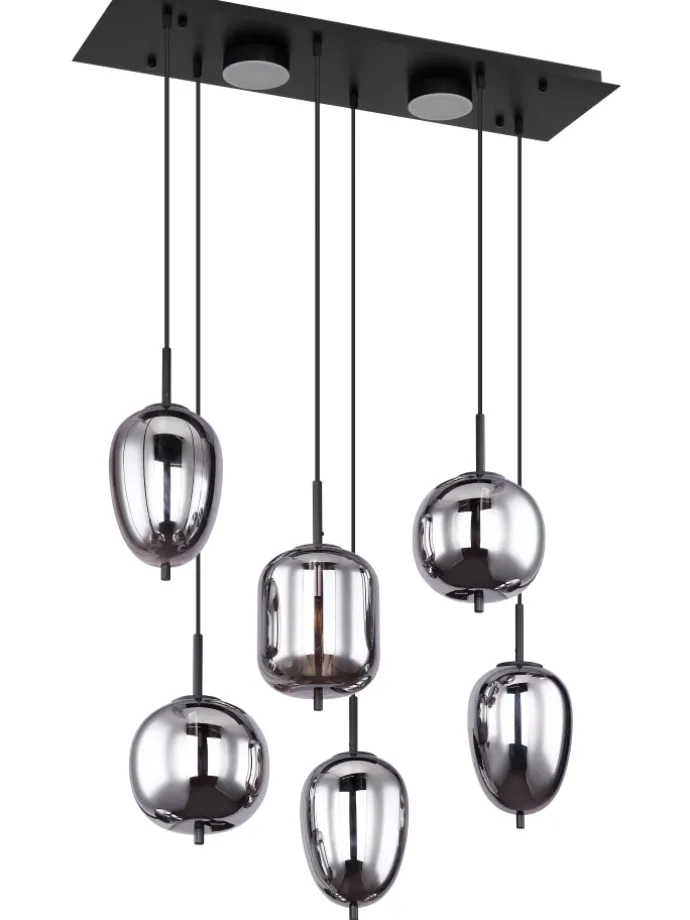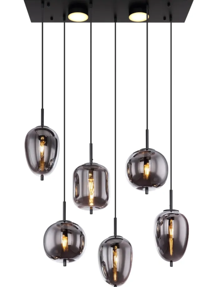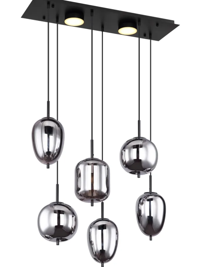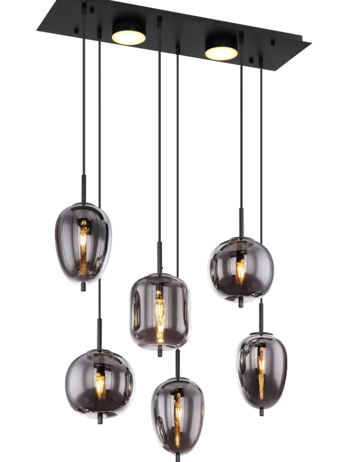 Hängeleuchte Metall schwarz matt, Glas rauchfarben, Acryl opal, Kabel PVC Schwarz, mehrere Stufen über Wandschalter, Memoryfunktion, Höhe kürzbar, 3 Stufen: nur E14, nur LED, beides zusammen, LxBxH: 800x340x1200mm, Glasdurchmesser: 2 x 15,8 cm, 2 x 16,5 cm, 2 x 18,5 cm, exkl. 6x E14 40W 230V, inkl. LED 21W 230V, 989lm Source, 635lm Output, 3000K