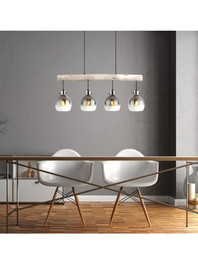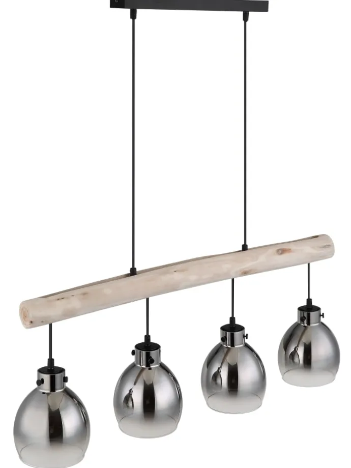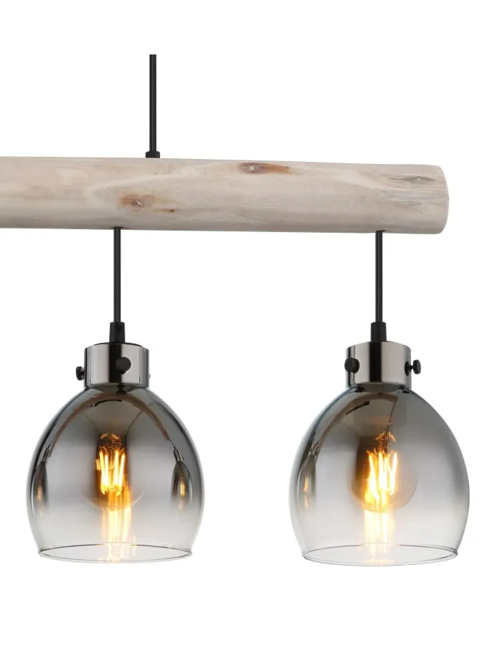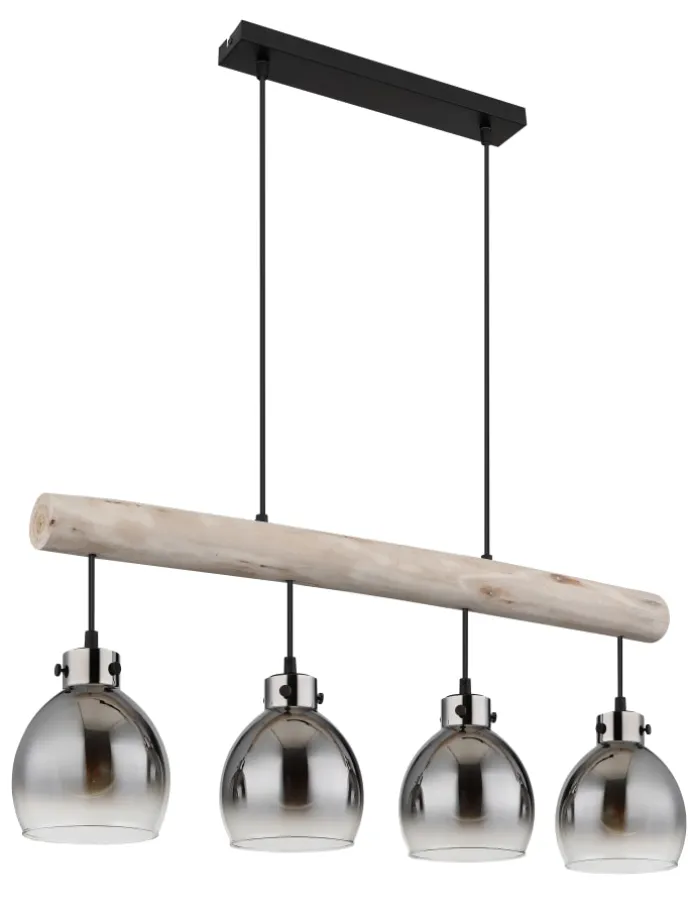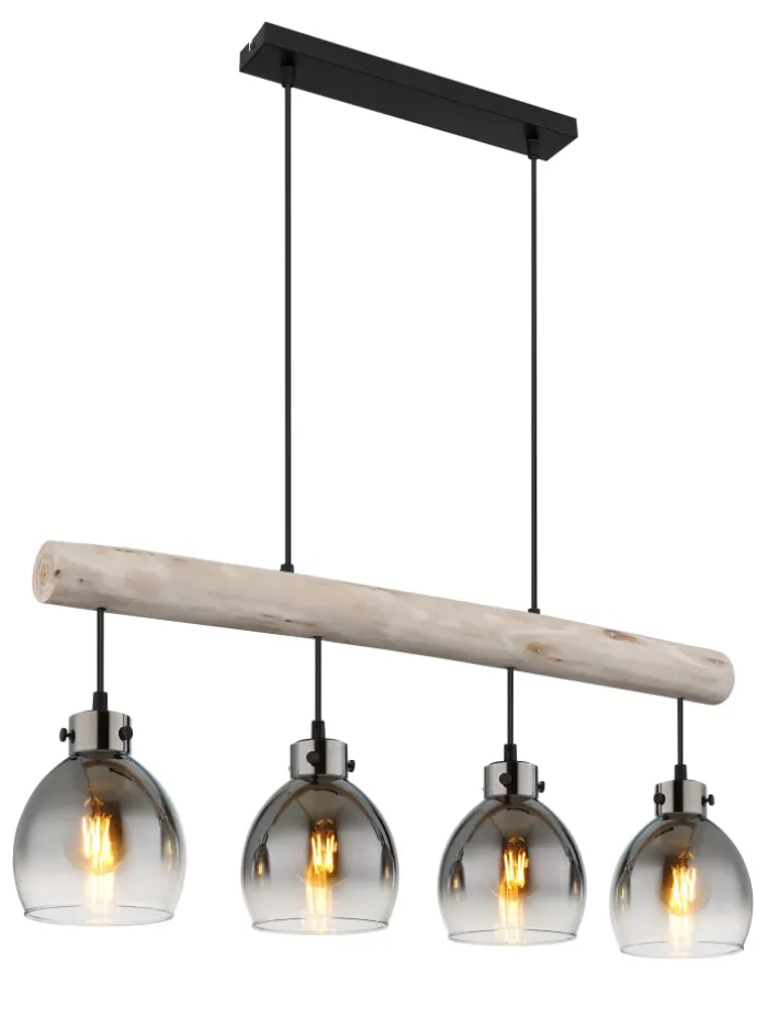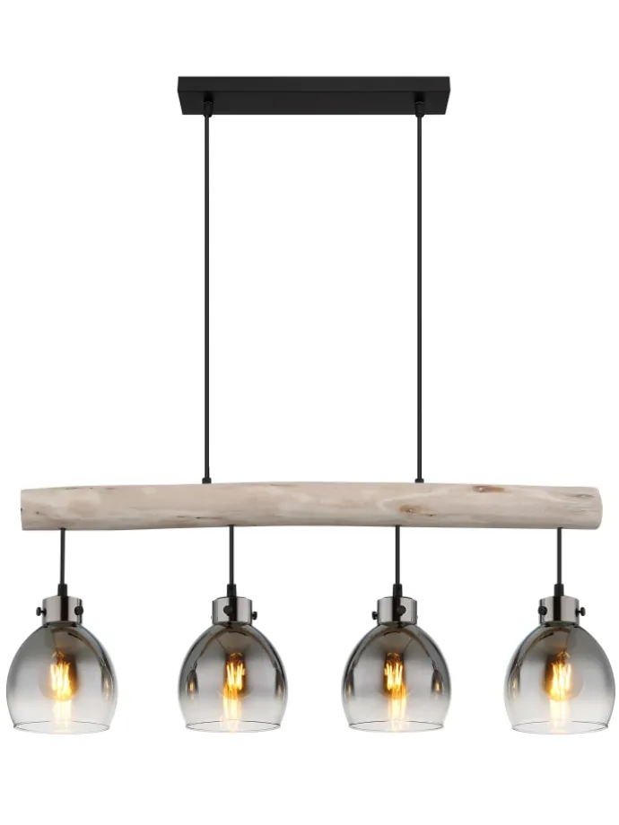 Hängeleuchte Metall schwarz matt, Holz naturfarben, Glas rauchfarben, Kabel PVC Schwarz, LxBxH: 825x150x1400mm, exkl. 4x E27 40W 230V