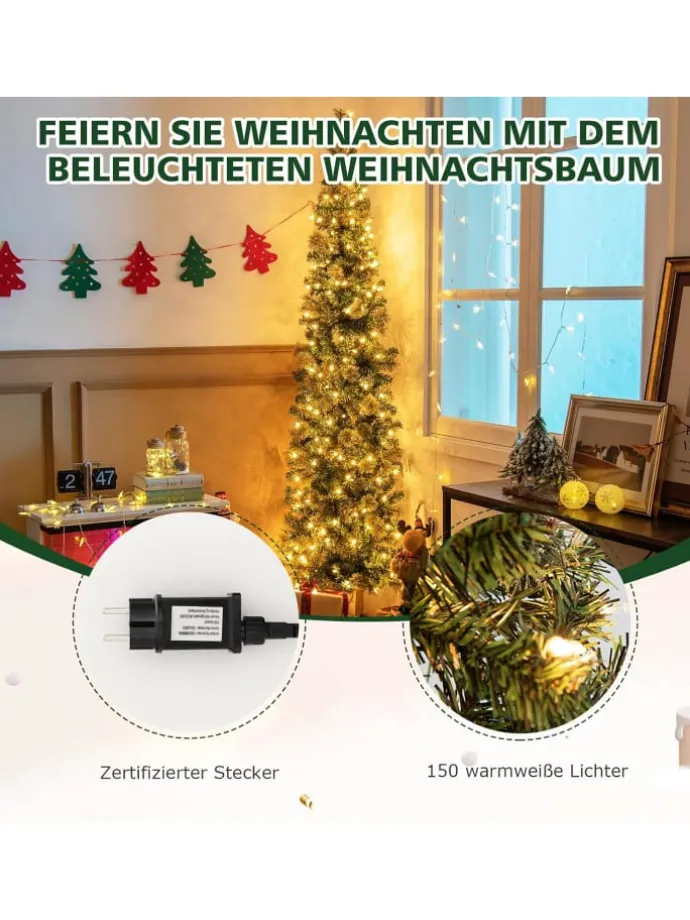 Unser 210 cm vorgeleuchteter Weihnachtsbaum ist mit einer einzigartigen und exquisiten halben Form gestaltet, die gegen die Wand gestellt werden kann, um mehr Bodenfläche zu sparen, ohne die wahre Farbe des Weihnachtsbaums zu verlieren. Darüber hinaus bieten wir 150 warmweiße LED-Lichter, die bereits auf den Zweigen angebracht sind, um Ihre Weihnachtsnacht zu beleuchten und gemütliche Zeit mit Ihrer Familie zu teilen. Der halbe Weihnachtsbaum verfügt über 403 PVC-Blätter und Kiefernnadeln in verschiedenen Farben, die ein realistischeres und lebendigeres Erscheinungsbild schaffen. Und das neue PVC-Material zeichnet sich durch hohe Flammen- und Rissbeständigkeit aus und garantiert eine lange Lebensdauer. Zur einfacheren Lagerung kann der Baum leicht in 3 Teile und einen faltbaren Metallständer zerlegt werden. Dieser vorgeleuchtete Weihnachtsbaum ohne hängende Verzierungen ermöglicht es Ihnen, eine süße Dekorationszeit mit Ihrer Familie und Freunden zu genießen!