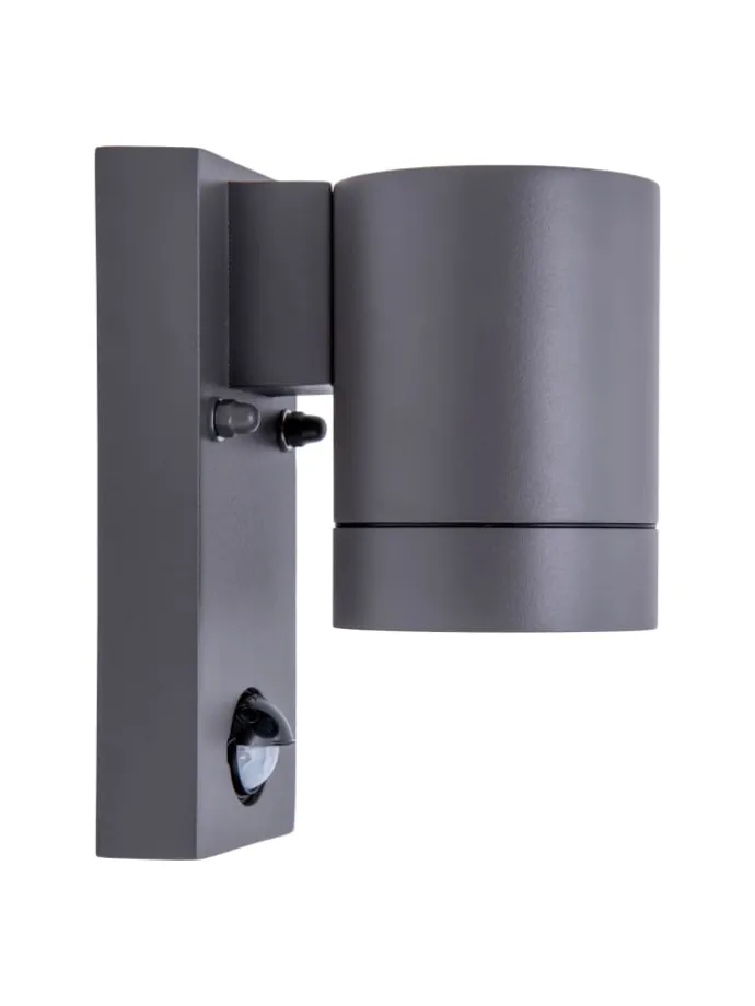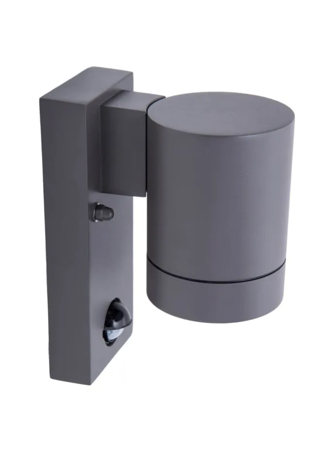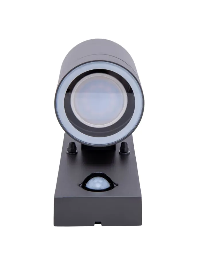 Die Außenwandleuchte „Rombe“ ist schlicht, elegant und praktisch. Der integrierte Bewegungsmelder der mattschwarzen Außenlampe sorgt ab Einbruch der Dunkelheit für mehr Sicherheit rund ums Haus, er schaltet das Licht – bei Bewegungen im Erfassungsbereich des Sensors, automatisch ein und nach einer bestimmten Zeit wieder aus. Die Leuchte besitzt eine Fassung mit der Größe GU10 und kann mit entsprechenden LED-Leuchtmitteln bis maximal 35 Watt bestückt werden.