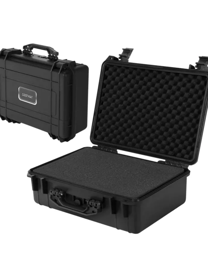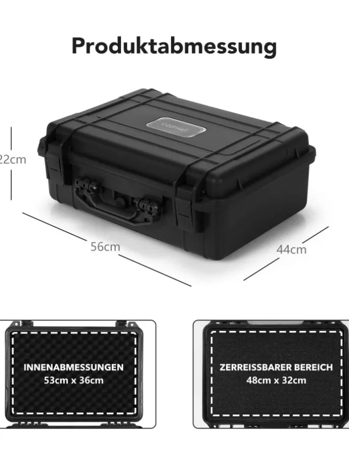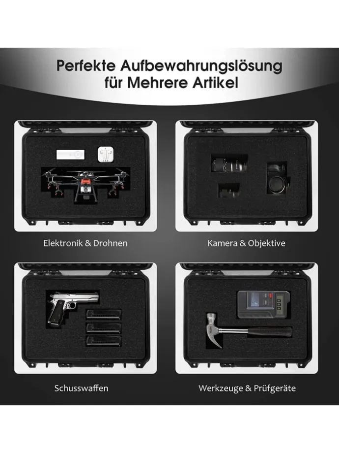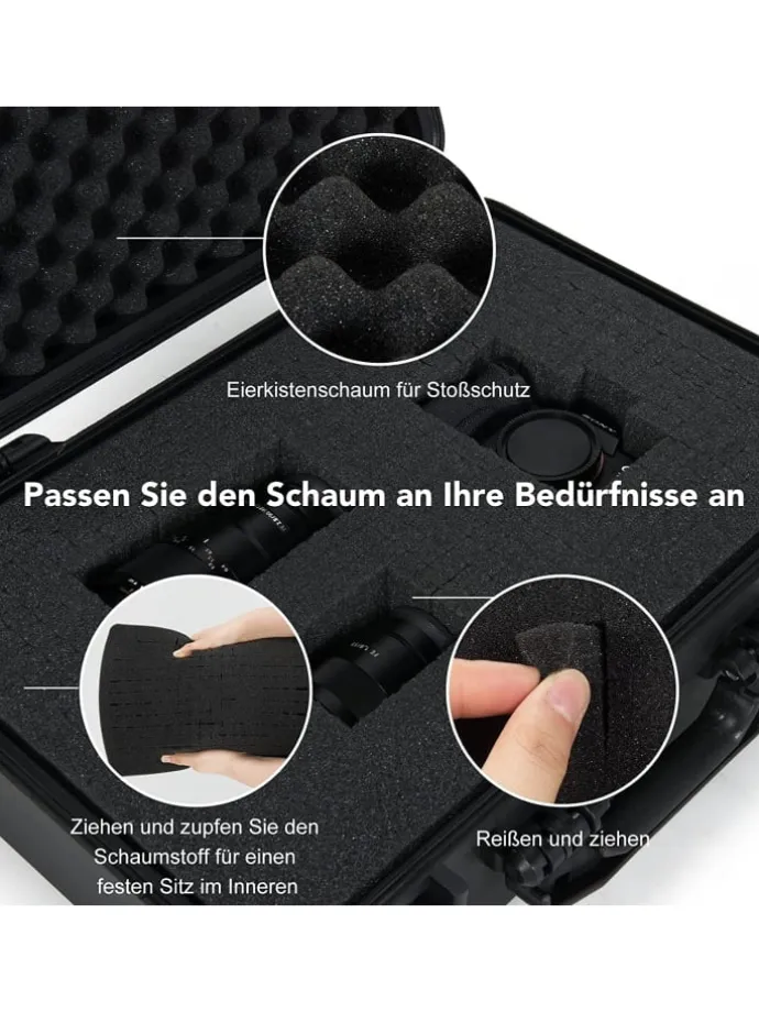 Er besteht aus hochwertigem PP, wodurch er kratzfest, bruchsicher und langlebig ist. Außerdem ist er wasserfest und schützt die Gegenstände im Inneren damit optimal. Dazu trägt auch der flexible Schaumstoff bei. Das Druckablassventil macht die Aufrechterhaltung des Luftdrucks außen und innen möglich. Im Inneren können Elektronik, Drohnen, Kameras usw. verstaut werden. Das macht den Koffer sehr praktisch.