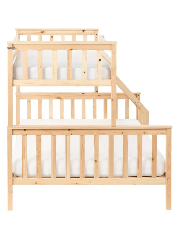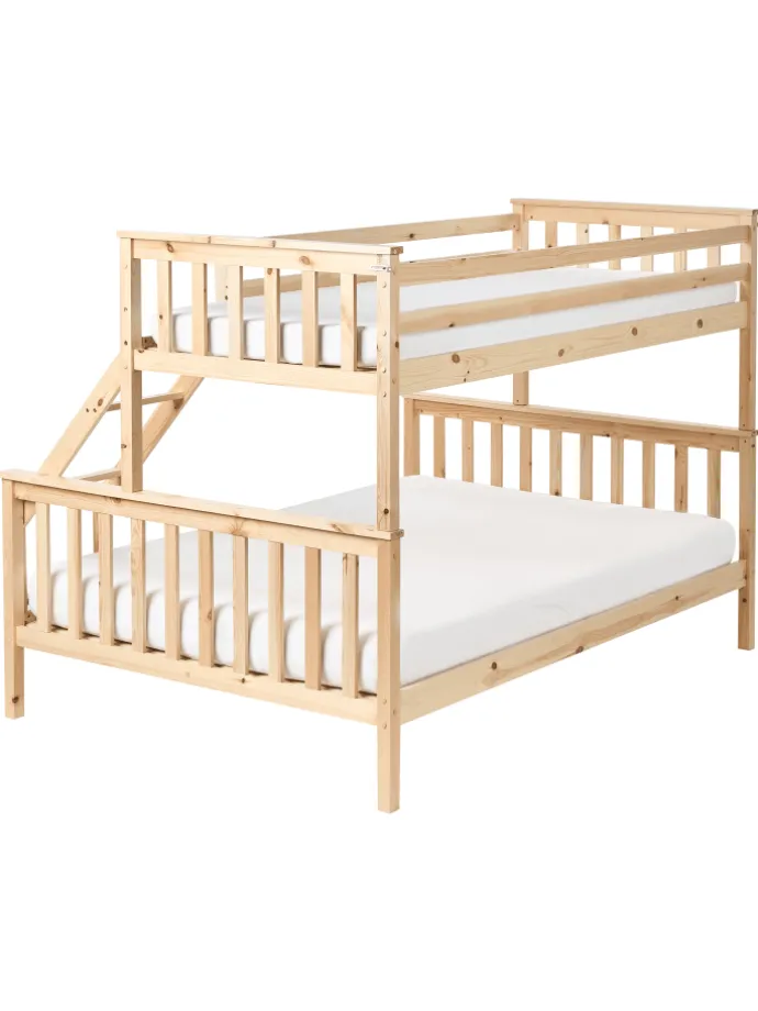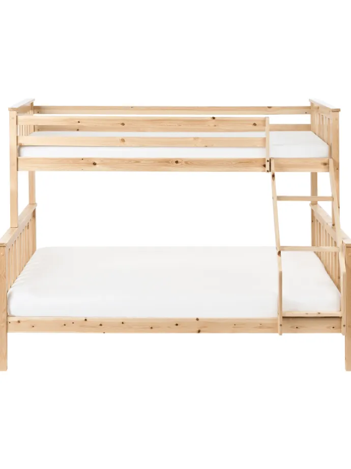 Robustes Holz-Etagenbett für 3 Personen mit Rausfallschutz und Leiter. Dieses Dreierbett kann nicht nur von Geschwistern genutzt werden, sondern auch als Familien- oder Gästebett eingesetzt werden. Oberhalb des Doppelbettes befindet sich ein Einzelbett, das über die mitgelieferte Leiter leicht zu erreichen ist. Ergänzt wird das Bett mit hohen Kopf- und Fußteilen sowie Gitterstäben, die beim oberen Bett als Rausfallschutz dienen. Zudem ist das Dreier-Hochbett vollständig aus robustem Kiefernholz gefertigt und mit bequemen Lattenrosten vervollständigt. Das kompakte Design und die langlebigen Materialien machen das Hochbett zu einer fantastischen Wahl, um jedes Schlafzimmer mit Funktionalität, natürlichem Charme und Beständigkeit zu bereichern.