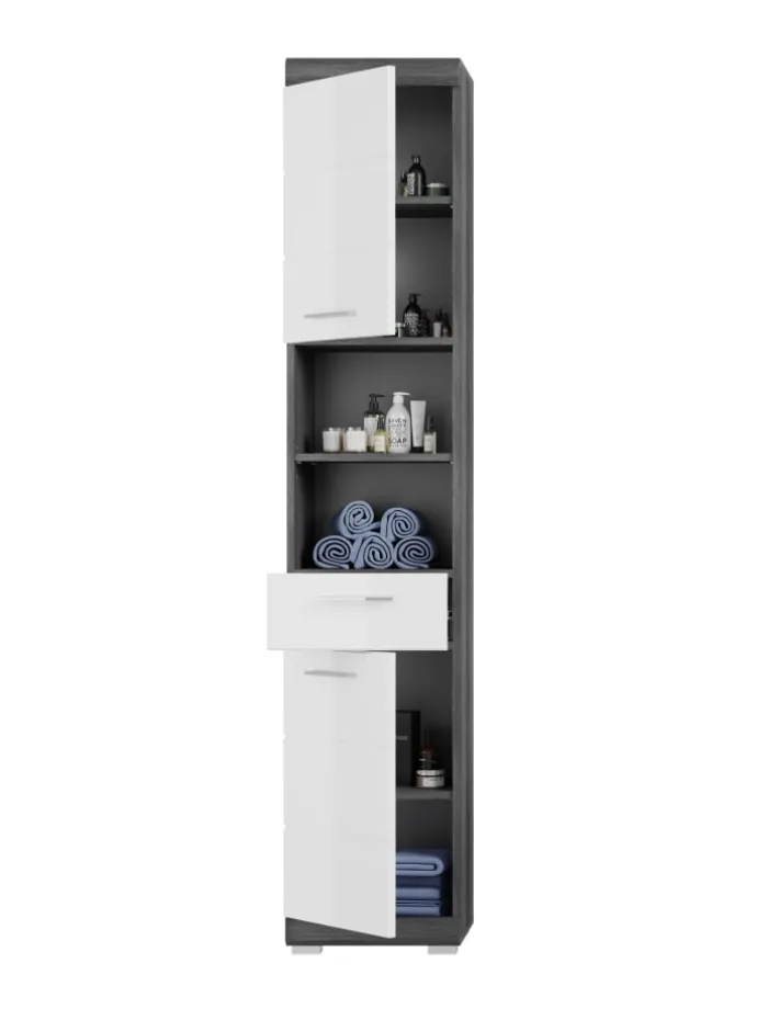 In unserem trendigen Sortiment präsentieren wir einen Badezimmer Hochschrank in angesagter Rauchsilber Nachbildung und weißem Hochglanz tiefgezogenem Finish, der deinem Badezimmer einen modernen Touch verleiht. Mit seinen schlanken Maßen von 37x191x31 cm bietet er nicht nur praktischen Stauraum, sondern auch ein stilvolles Design. Entdecke die perfekte Kombination aus Funktionalität und trendigem Chic mit diesem angesagten Hochschrank.