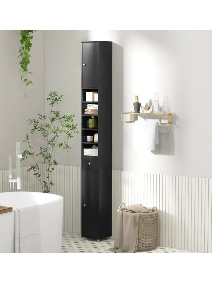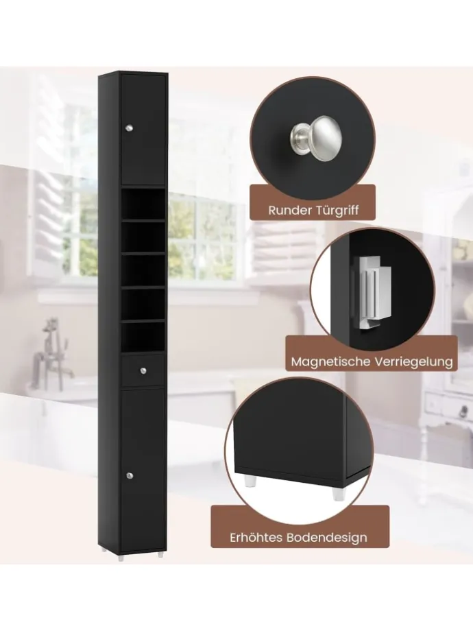 Dieser hohe Badezimmerschrank ist eine tolle Aufbewahrungslösung für kleine Räume! Dieser Schrank verfügt über eine geringe Stellfläche, aber große Lagerkapazität mit 2 Schränken, 5 Fächern und 1 Schublade, wodurch er sich perfekt für kleine Räume oder Ecken in Ihrem Haus eignet, um zusätzlichen Stauraum zu schaffen. Darüber hinaus gibt es 5 verstellbare Regale, die Ihnen individuell anpassbaren Stauraum bieten, um unterschiedlichen Aufbewahrungsbedürfnissen gerecht zu werden. Dieser Badezimmerschrank besteht aus hochwertigem MDF-Material und verfügt über eine langlebige und stabile Struktur. Und Benutzer können diesen Hochschrank mit der mitgelieferten Kippsicherung an der Wand befestigen, was für Familien mit Kindern und Haustieren sicherer ist.