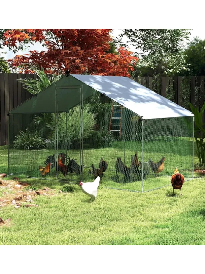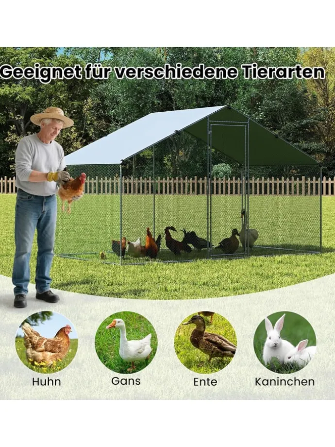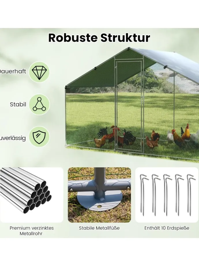 Unser begehbarer Hühnerstall ist eine umfassende Lösung zur Haltung von Geflügel. Er ist mit einem Oxford-Stoff-Überdach ausgestattet, das zuverlässig vor Nieselregen, Sonne und Schnee schützt und den Komfort der Hühner erhöht. Das spitzförmige Dach sorgt für eine effiziente Wasserableitung und hält das Innere trocken. Das Gestell aus verzinktem Stahl ist rostbeständig und langlebig, zudem ermöglichen die 10 mitgelieferten Erdanker eine sichere Verankerung. Das sechseckige Maschendrahtnetz sorgt für optimale Belüftung und Stabilität. Eine abschließbare Tür bietet zusätzlichen Schutz und erleichtert den Zugang sowie die Fütterung.