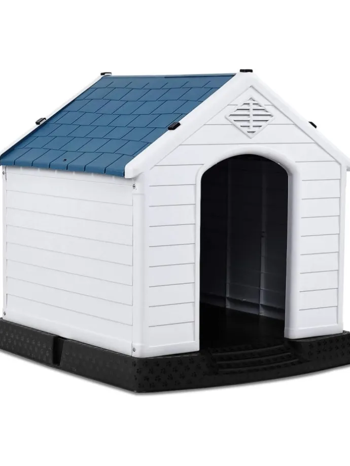 Die Hundehütte ist leichtgewichtig, sodass Sie sie einfach in Ihrem Zuhause umherbewegen können. Sie besitzt ebenfalls ein abnehmbares, blaues Dach, welches regen ablenkt und so verhindert, dass dieser ins Innere läuft. Zusätzlich fügt sich das stilvolle und schlichte Design dieses Hauses perfekt in Ihre übrige Außeneinrichtung ein. Der vorhandene Raum macht diesen Tierunterstand bestens geeignet für kleine und mittelgroße Hunde, wobei die Hütte ihnen ein Gefühl von Geborgenheit und Verlässlichkeit bietet.