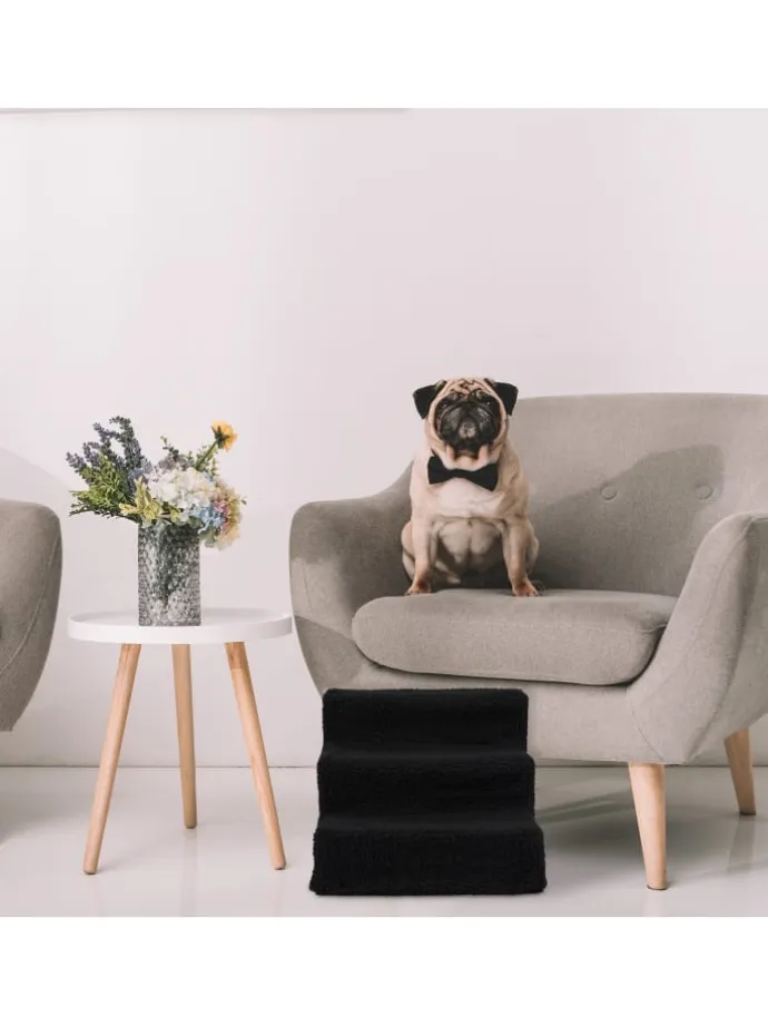 Wenn Ihr Vierbeiner seinen Schlaf- oder Kuschelplatz auf dem Sofa oder im Bett hat, dann ist die Hundestiege ein nützliches Hilfsmittel. Einfach an die Couch oder das niedrige Boxspringbett gelehnt, erleichtert die Hunderampe Ihrer Fellnase den Auf- und Abstieg. Ohne zu springen oder von Ihnen hochgehoben werden zu müssen, gelangen auch alte oder kranke Hunde sowie Katzen gelenk- und rückenschonend auf das Möbel. Dank des waschbarem Polyester-Bezugs ist das Treppchen schonend zu den Pfoten.